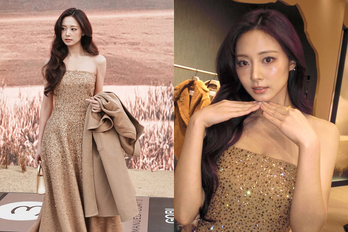 周子瑜20日出席日本東京表參道Max Mara「THE CAMEL, timeless」快閃店開幕活動,為致敬品牌標誌性的駱駝色,子瑜穿著一身Max Mara Resort 2026的駝色平口禮服,上頭有大小錯落水鑽鋪蓋,讓整身散發出金色光芒,外罩品牌經典Ludmilla Icon Coat駝色羊絨大衣,並運用金色的Whitney Nano Bag來襯托、統整色調,搭配上閃亮水光的妝容,讓子瑜宛如沙漠中的女神降臨,實在太美了!