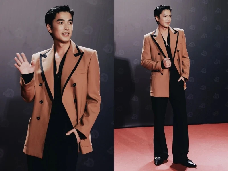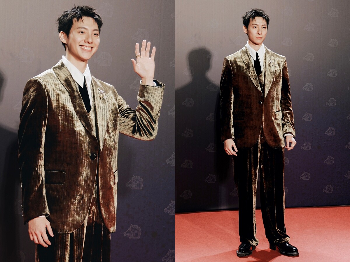 在金鐘獎以亞曼尼西裝展現高冷男神風格的彭千祐,在本屆加入紅毯主持群,率先踏上紅毯的他,再度選擇了Emporio Armani的設計,這次以2025秋冬系列中的秀款造型亮相,咖啡色天鵝絨面的條紋西裝本身就很有特色,在燈光之下的光澤感在紅毯上更是奢華亮眼。