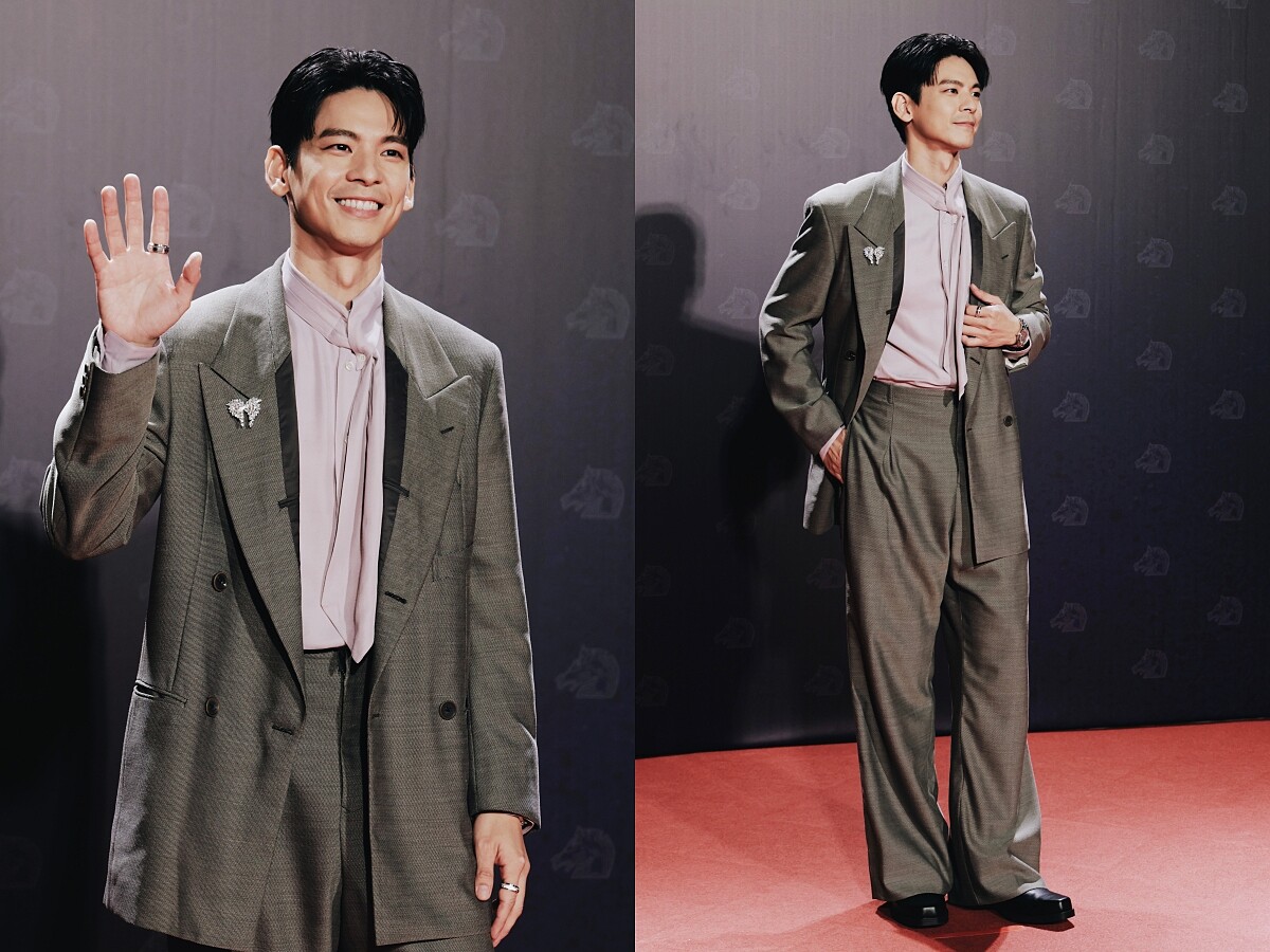 今天擔任金馬獎頒獎嘉賓的林柏宏,今天身上的灰色西裝是來自拿下2025 LVMH Prize首獎的Soshiotsuki所推出的改良版日本昭和西服,他選擇搭配上帶點中性氣息的紫色領口繫帶襯衫,自然的垂墜感讓他看起來有種柔美的魅力。
