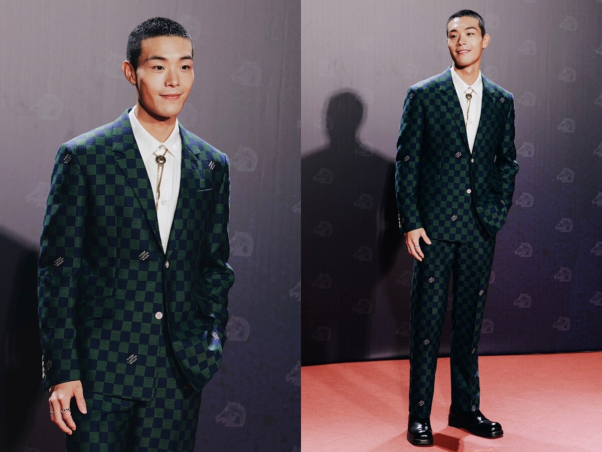 牧森的穿搭也在本次的紅毯眾星中脫穎而出,他選擇穿上路易威登的西裝亮相,整體以藍色與綠色棋盤格設計的西裝,滿版圖樣帶點花俏的繁複感,在牧森模特身材的詮釋之下,也成為紅毯上難忘的穿著之一。