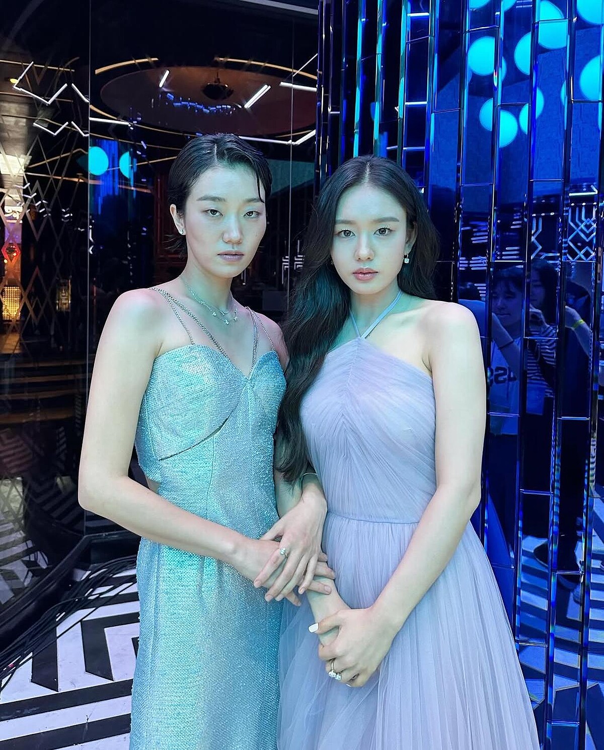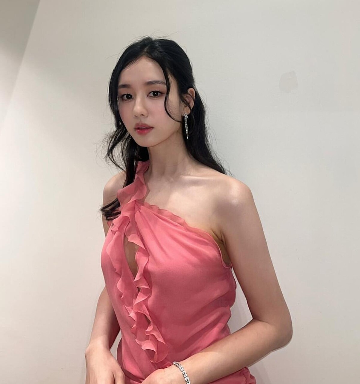 安恩真經過認真自律的鍛鍊,養成了優美的肩頸線條,穿上這件粉色的荷葉邊禮服,正好展現出自信的面貌,尤其是中央的小心機鏤空設計,更讓粉絲們為她深藏不露的好身材給驚艷!