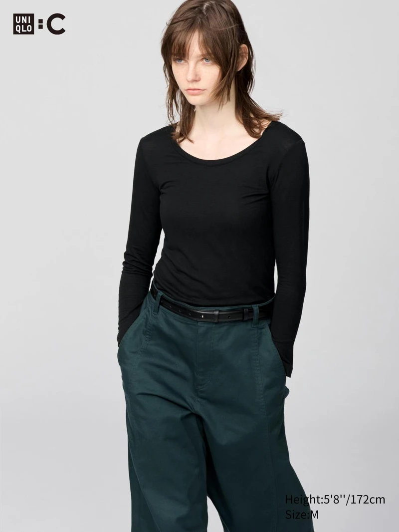 保暖不厚重、適合疊穿的輕奢U領發熱衣!同樣採用喀什米爾混紡,這款以U領為亮點,領口修飾度好的同時,也更適合搭配襯衫、圓領毛衣與各種外套,布料柔軟、保暖效能穩定,貼膚感舒適不刺膚,是需要細肩帶、毛衣外穿時很好搭配的「零干擾內搭款」,對怕悶、怕厚重的人來說也是非常友善的選擇。