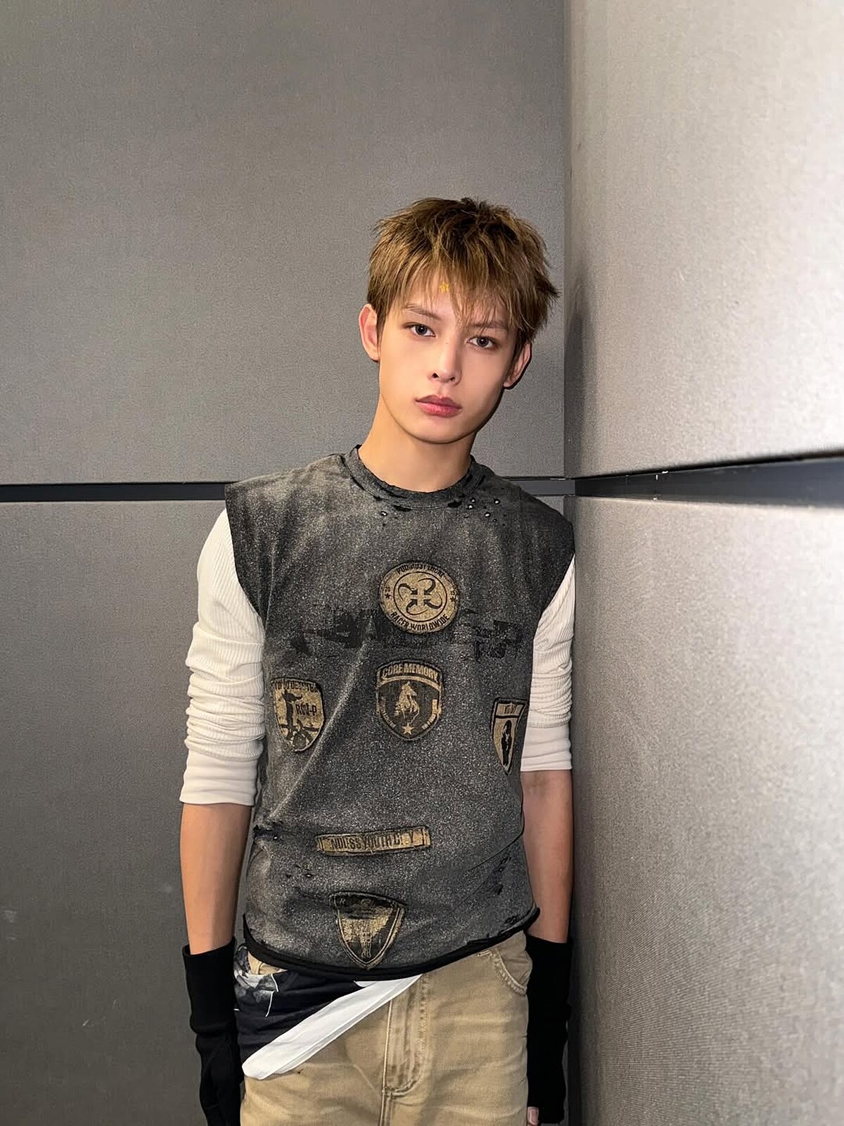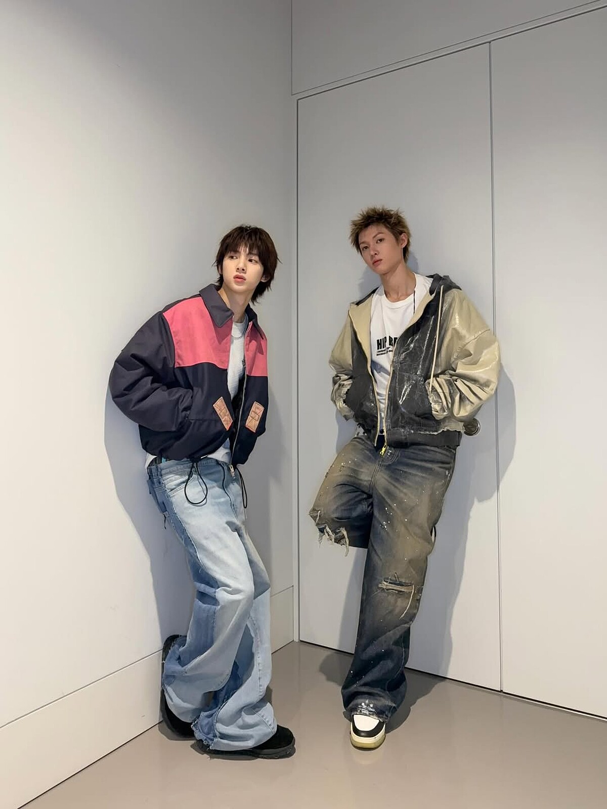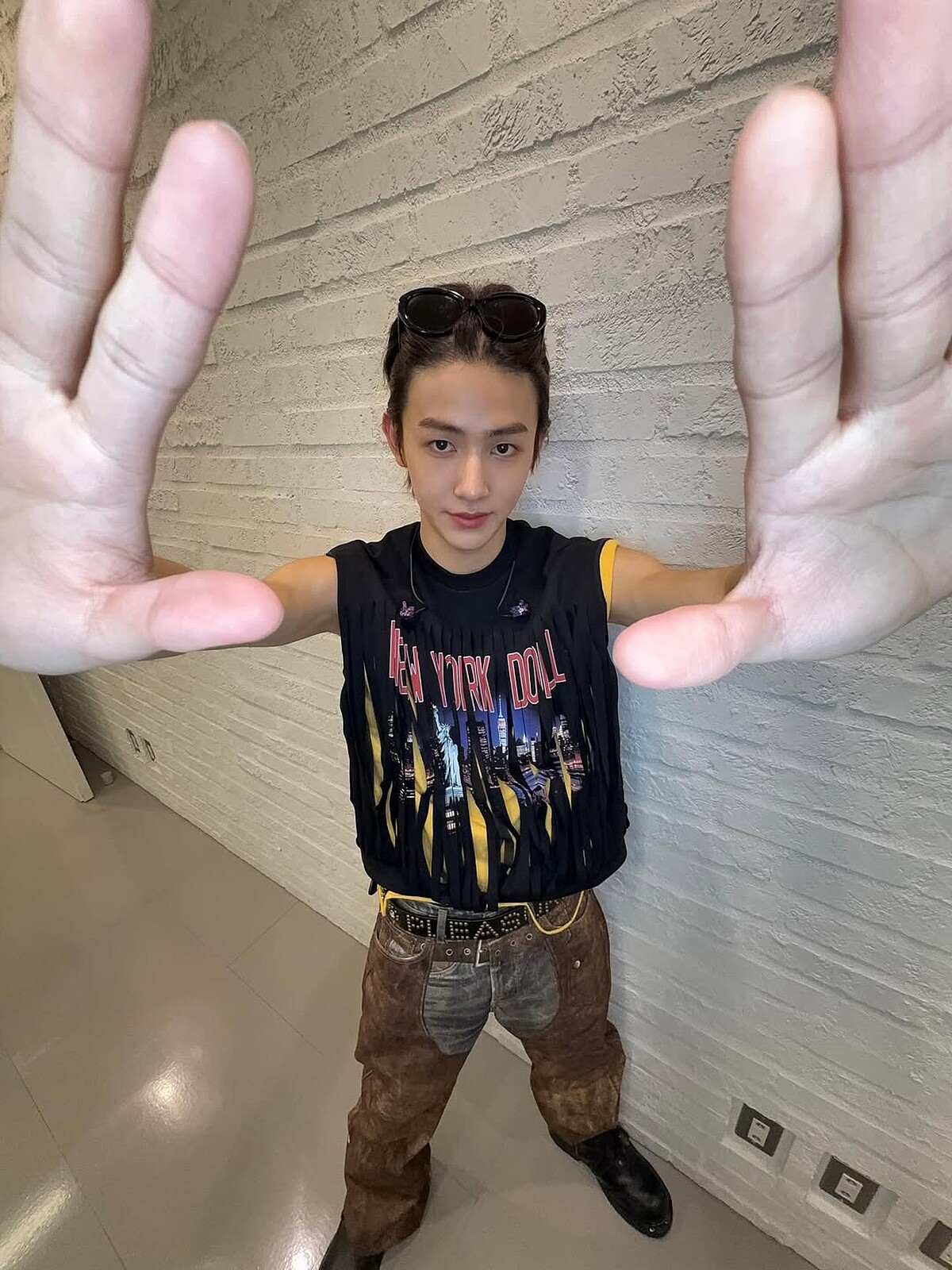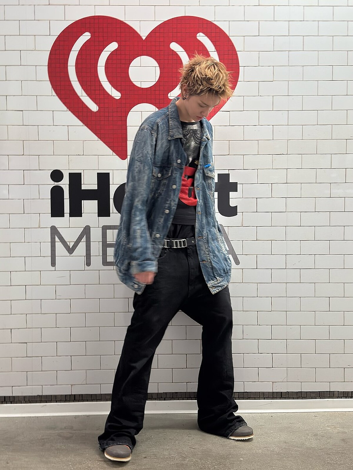 190 公分的朴宇宙 Martin,是團內的完美衣架子,也是最能消化多層次穿搭的人。下圖他以長版丹寧襯衫搭配設計圖案 T-shirt 疊穿,下身選擇低腰褲與金屬皮帶,營造視覺焦點。雖然元素多,但整體乾淨俐落,是「街頭風入門」最能參考的範本!