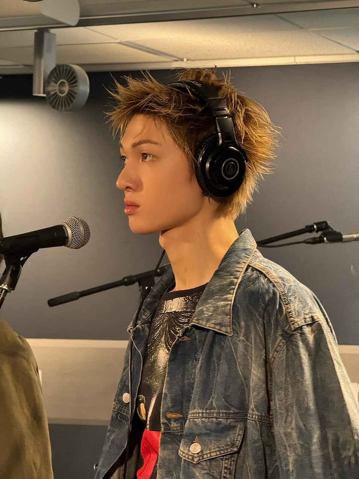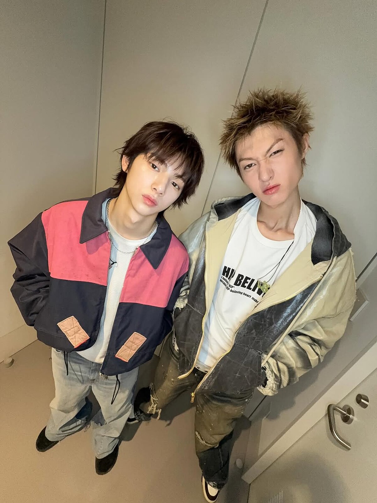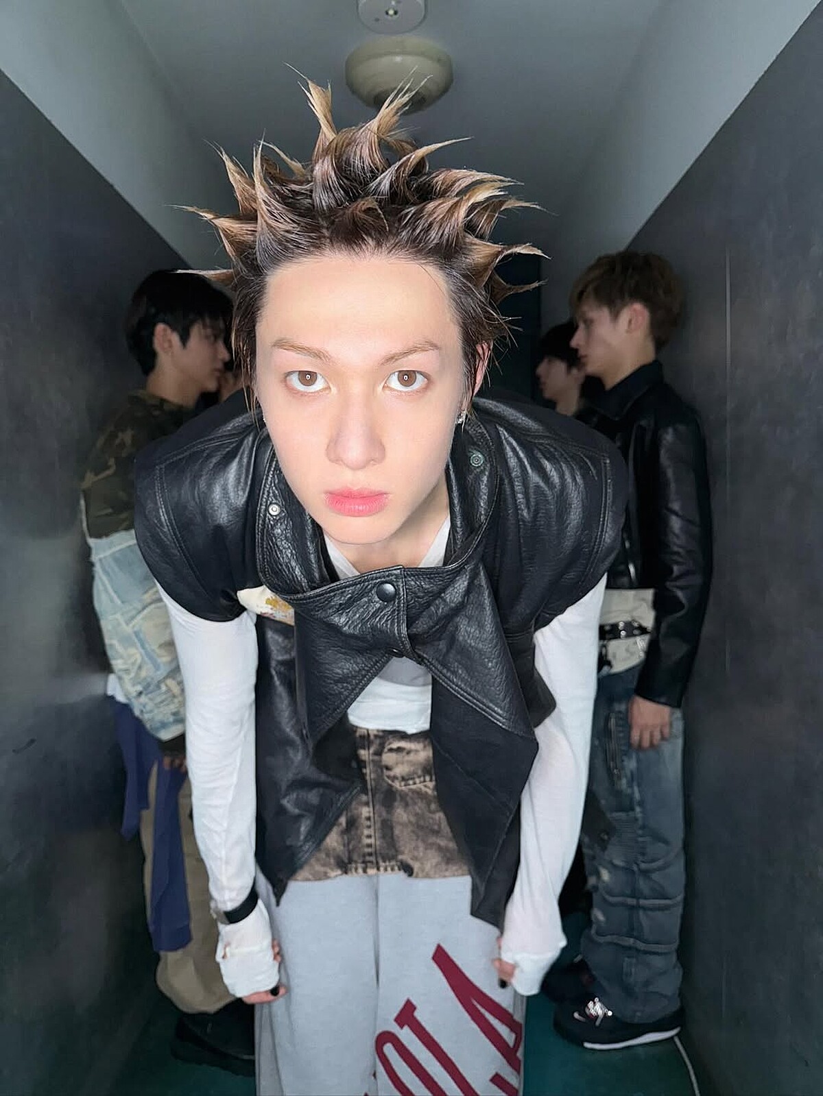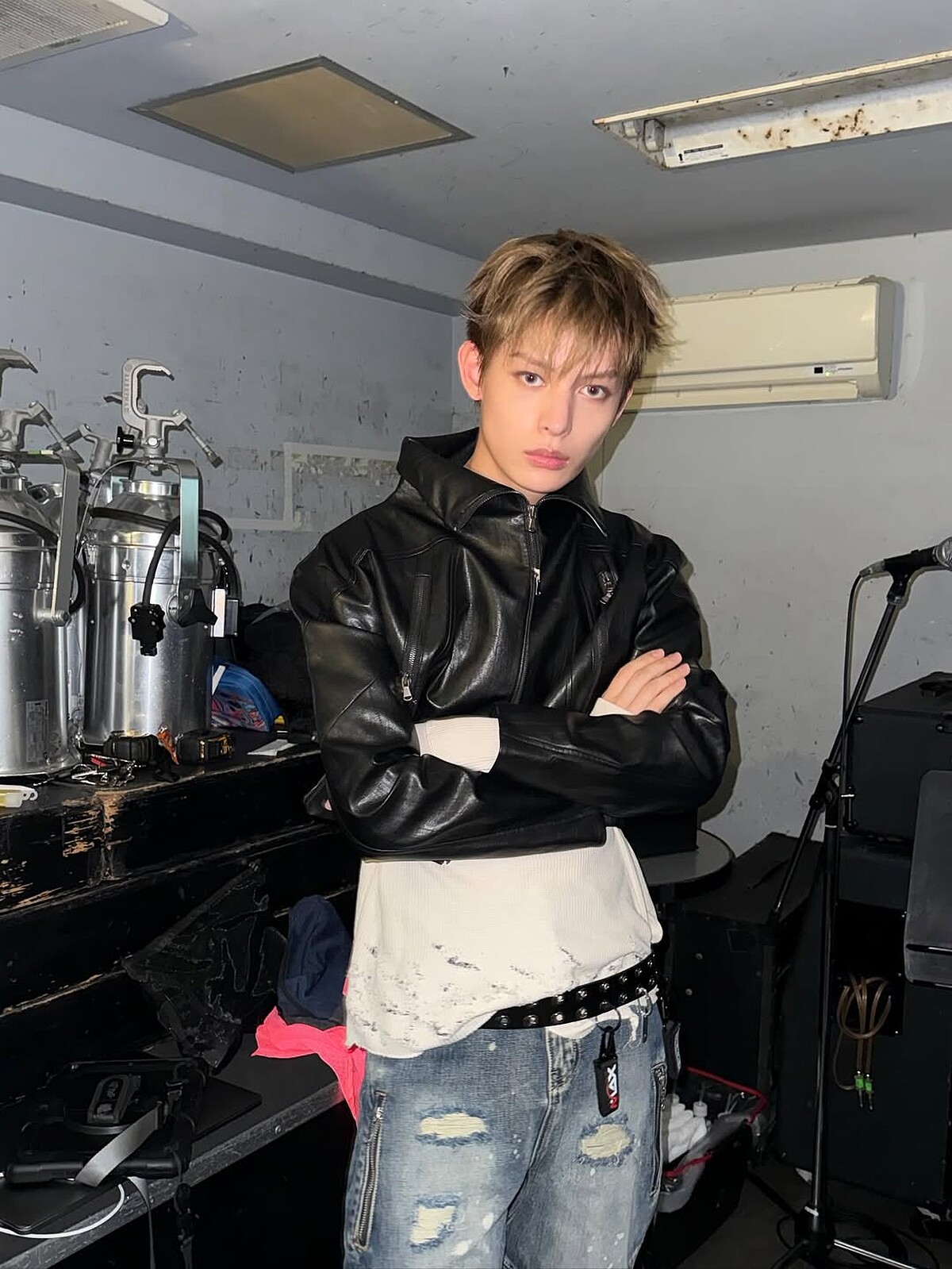 190 公分的朴宇宙 Martin,是團內的完美衣架子,也是最能消化多層次穿搭的人。下圖他以長版丹寧襯衫搭配設計圖案 T-shirt 疊穿,下身選擇低腰褲與金屬皮帶,營造視覺焦點。雖然元素多,但整體乾淨俐落,是「街頭風入門」最能參考的範本!