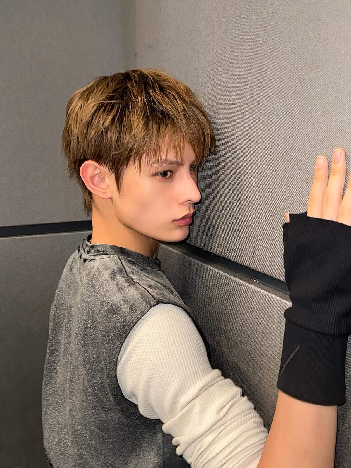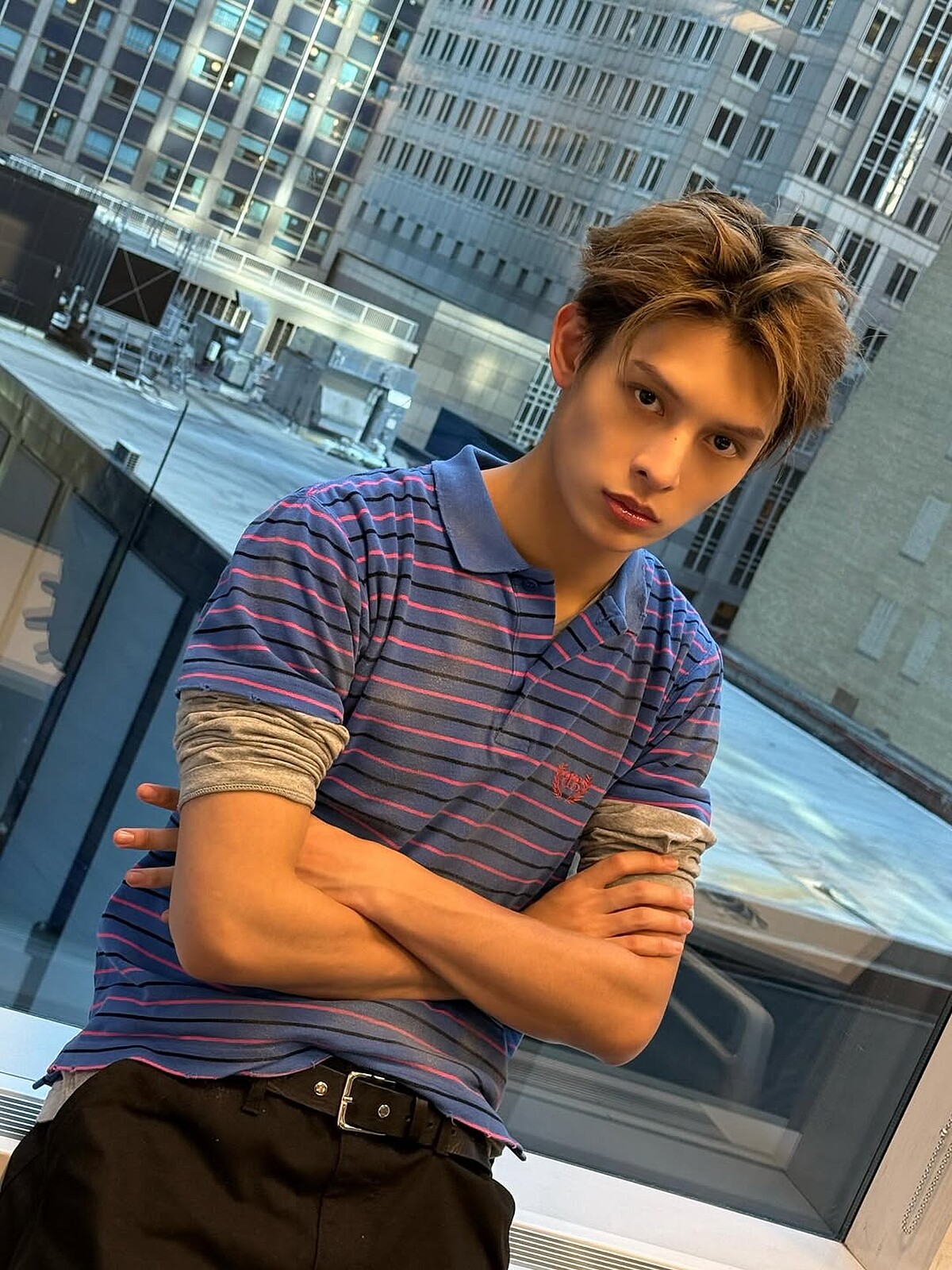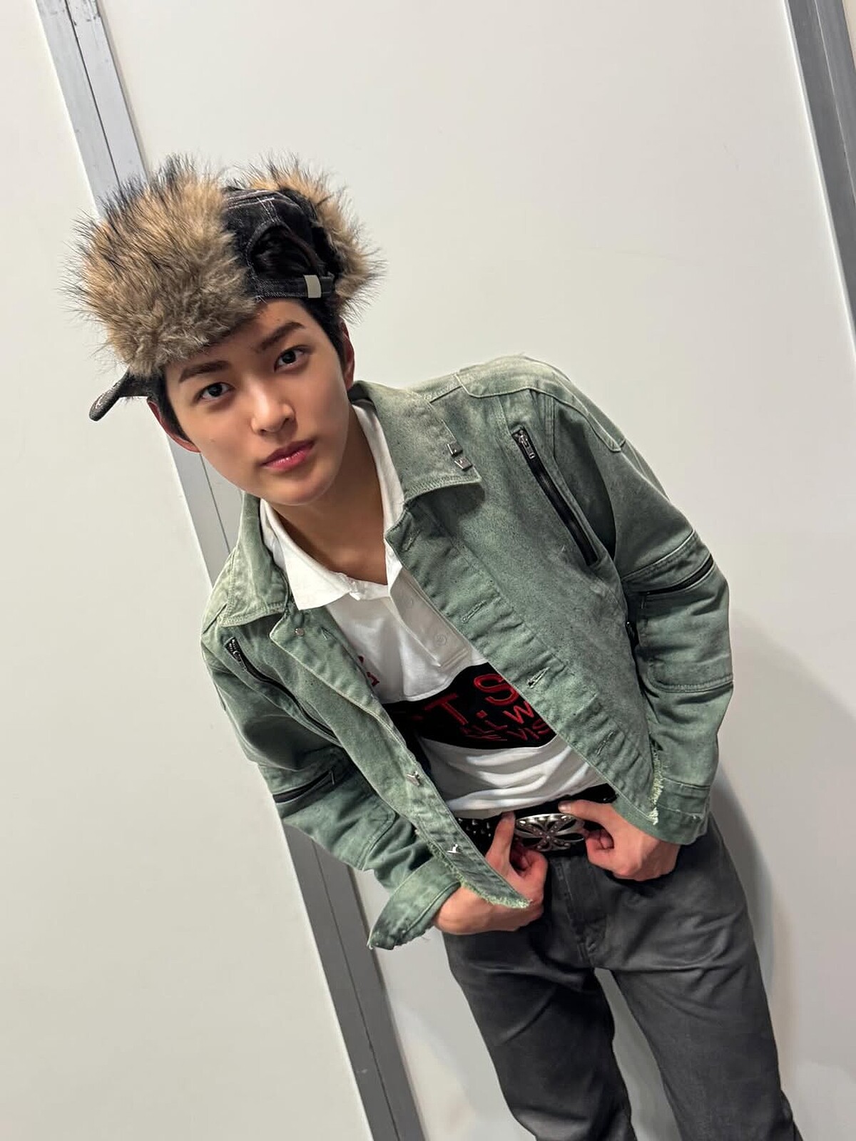 童模出身的 Juhoon金主訓,非常適合乾淨的鄰家氣質。他常以素色 T-shirt 外搭襯衫式外套亮相,就能做出最簡單也最耐看的日常層次。外套的軍裝輪廓也帶點英倫學院風,適合學生與喜歡清新風格的質感男士。