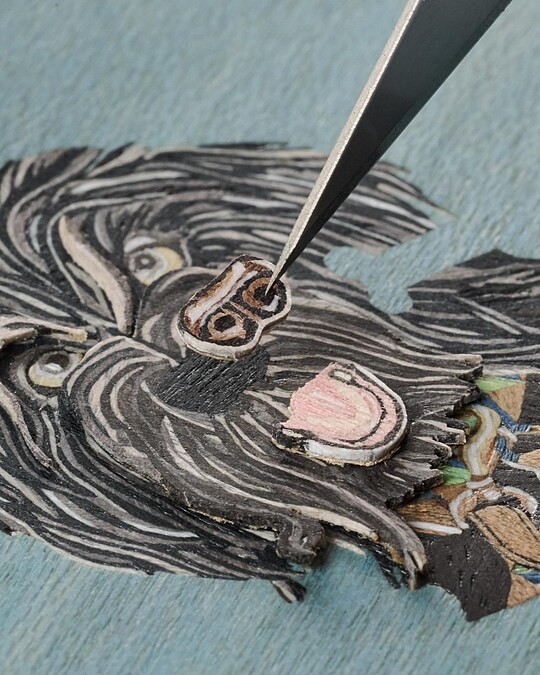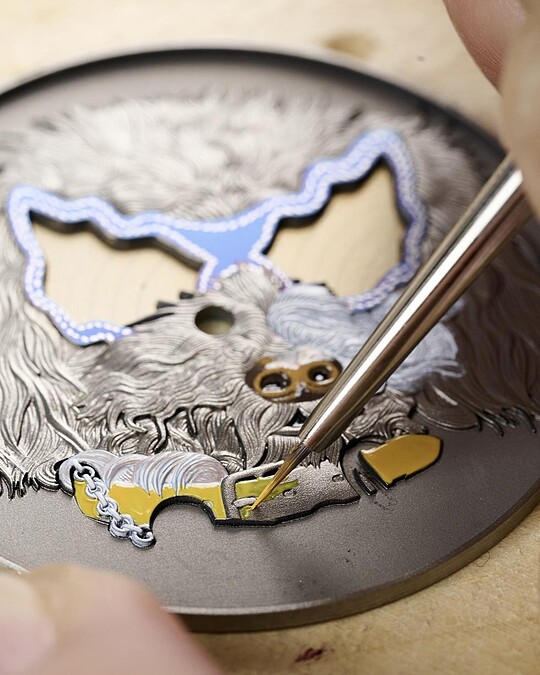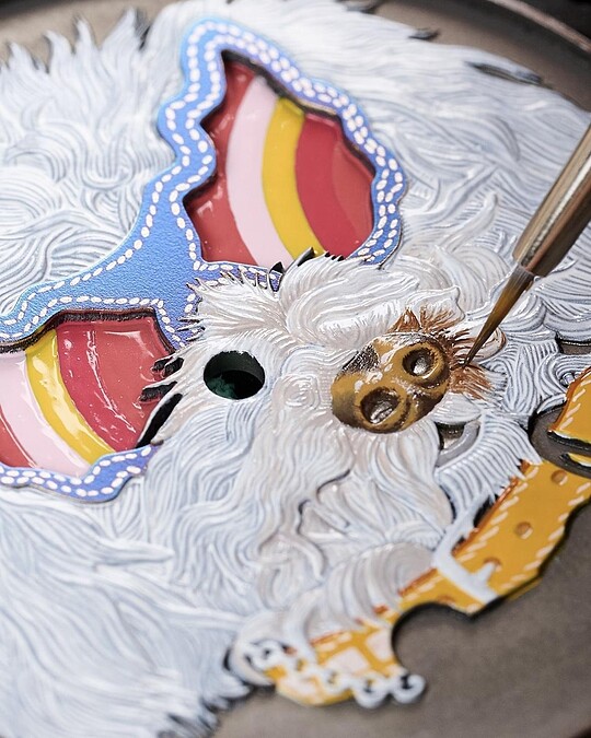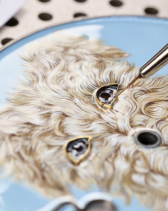 首先出場的是黑白相間雙色的毛茸茸小狗Orson。其圖案主要以木片鑲嵌工藝精製:過程如拼圖一般,每個部位細節需事先定位、切割,再組裝黏合;其嘴巴、眼睛、鼻子和舌頭皆再上色,總數有八種不同木片材質構成,讓光影和層次更具豐富生命力。戴著貓眼墨鏡的小狗Amy, 面盤圖案聚焦鐫刻與微繪:細膩筆觸需經過多次反覆烘烤才得以成形。最後,白色的Taco以微繪及掐絲琺瑯工藝精心匯成:錶盤底部先以藍色琺瑯燒製,再於表面手工繪製捲曲毛髮,另外,是掐絲琺瑯工藝(先以粗細不一的金絲勾勒輪廓,並在燒製過程中融入琺瑯)凸顯毛流和五官的立體層次。骨頭造型名牌則以皮革工藝製成——再次巧妙回扣愛馬仕的工藝精神核心之一。
