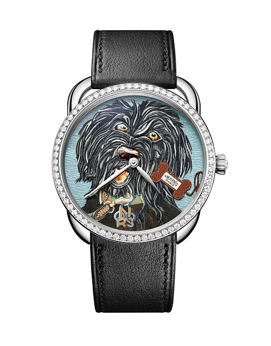 在Hermès多個腕錶系列中,誕生於1978年、出自Henri d’Origny 設計的Arceau,以流暢優美的線條曲線和不對稱錶耳巧思,轉化了馬鐙造形和品牌馬術淵源,是一眼可辨的品牌訊息。這次,愛馬仕毫無懸念地選擇帶有一絲玩味的Arceau,成為新成員狗狗們的最新「舞台」。