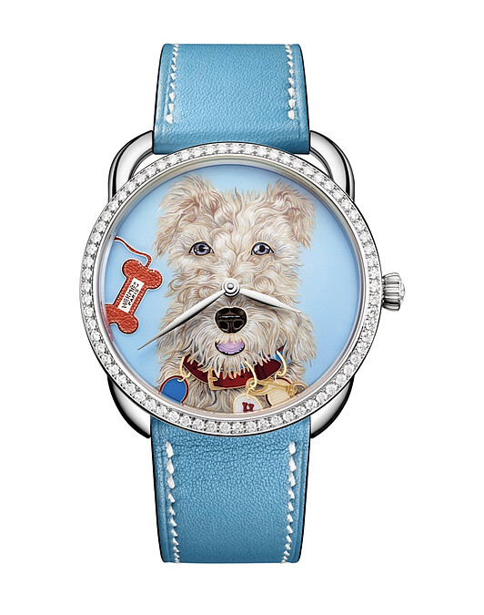 新款Arceau Jour de casting腕錶的面盤圖案是吸睛亮點。靈感來自藝術家Liz Stirling設計的Jour de Casting絲巾:色彩筆畫細膩勾勒毛色和毛流的狗狗們,戴著精緻項圈擺出可愛美姿,旁邊點綴不同圖騰的精緻牽繩和皮質畫風的骨頭名牌......轉入錶盤的三隻狗狗,則以微縮彩繪、木片鑲嵌以及琺瑯等等工藝更添藝術元素。