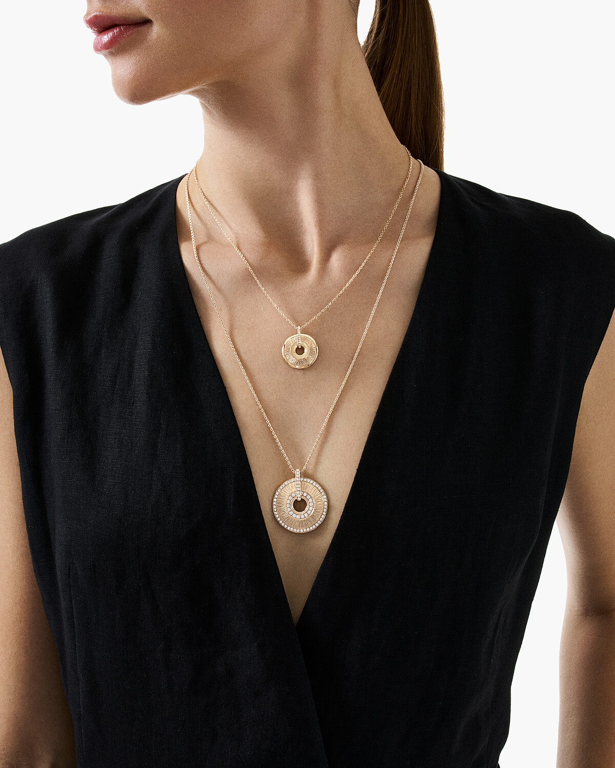 TALISMANS 徽章墜飾(上) 18K 黃金鑲嵌鑽石。 建議售價 NTD 236,000 元 ETERNAL N°5 項鍊(下) 18K 黃金鑲嵌鑽石。 建議售價NTD 312,000元