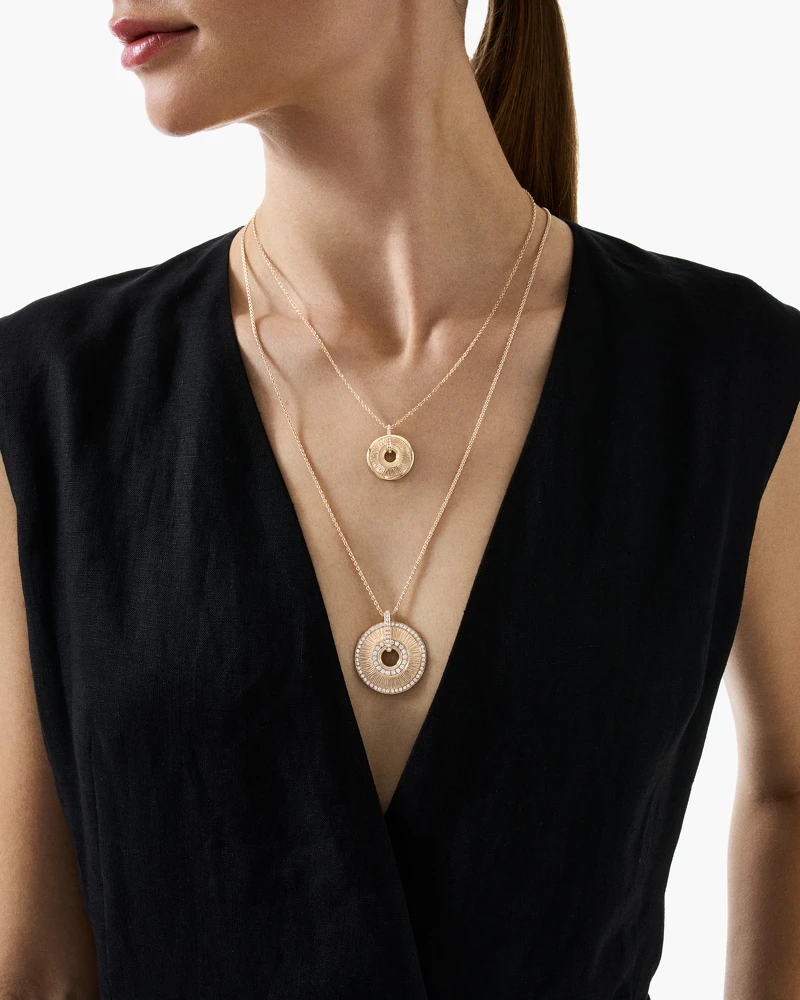 TALISMANS 徽章墜飾(上) 18K 黃金鑲嵌鑽石, 建議售價 NTD 236,000 元 。 ETERNAL N°5 項鍊(下) 18K 黃金鑲嵌鑽石, 建議售價NTD 312,000元