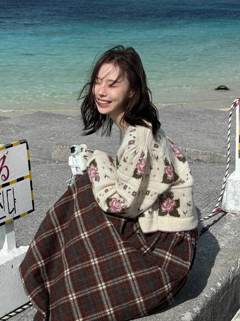 柔軟的針織外套很容易會讓整體穿搭帶著溫柔感,搭配上暖棕色的格紋長裙,營造出浪漫又帶有復古感的秋冬氣息,毛衣的泡泡袖加入可愛感,而棕色格紋則是強化了季節感與層次,整體配色溫暖柔和,展現了甜美慵懶的度假風格。