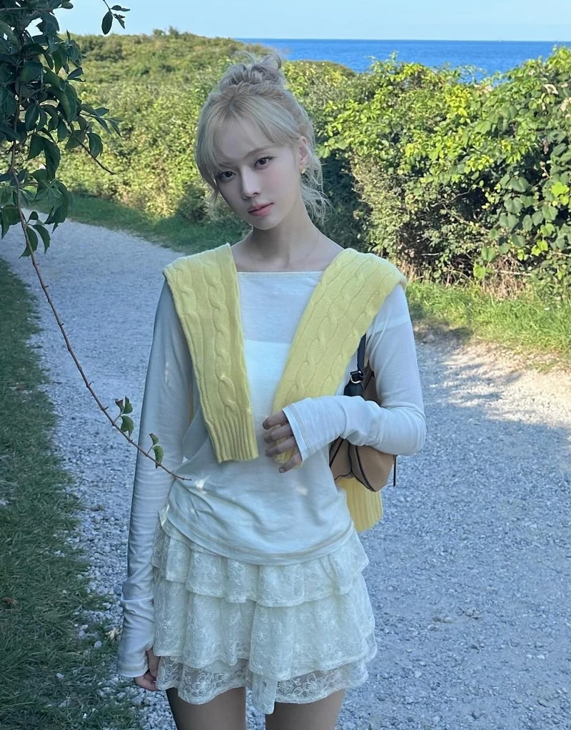 這套穿搭以奶油色調為主,展現出清爽的少女感,內搭白色短背心,外罩貼身長袖T恤,下身搭配多層次的蕾絲蛋糕裙,增添了甜美和浪漫的氛圍,最亮眼的是斜披在肩上的亮黃色針織衫,為整體造型注入了活潑的亮點。