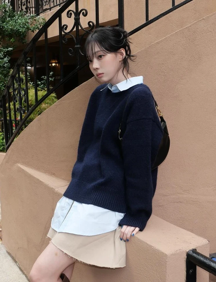 經典的學院風疊穿,Winter以深藍色寬鬆圓領毛衣,內搭一件淺藍色襯衫,露出襯衫領子和下襬打造層次細節,下身的卡其色A字短裙,讓整體展現出知性、簡約帶有美式學院風格的氛圍。