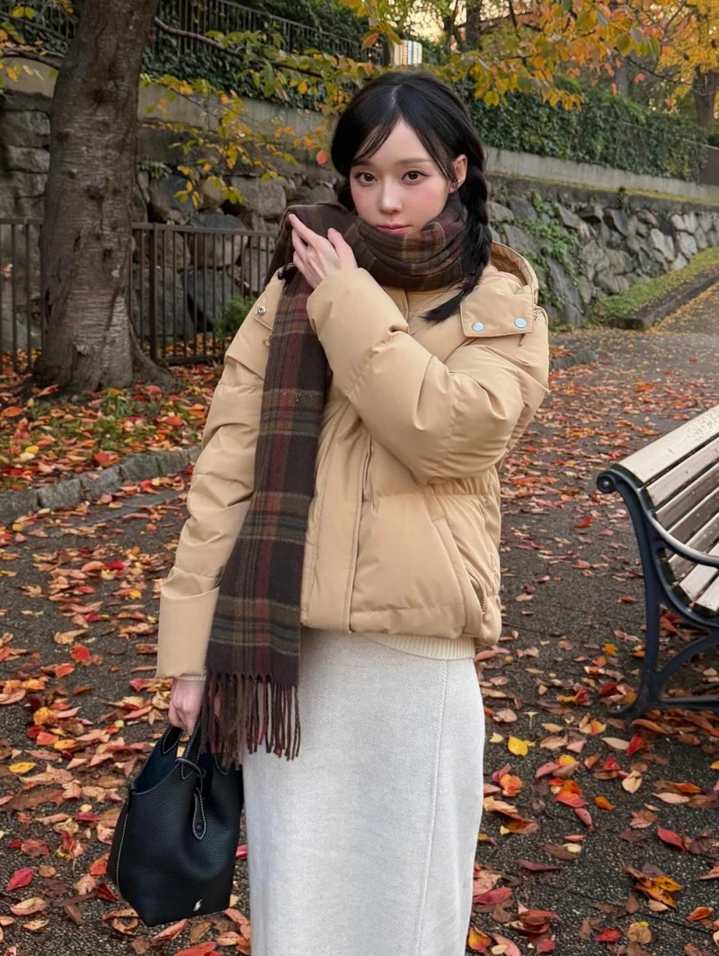 卡其色短版羽絨外套搭配同色系的針織長裙,整體色調柔和統一,再加上棕色格紋流蘇圍巾,不僅保暖,更為單色系的穿搭增添了亮點細節,是優雅又保暖實用的冬季單品組合。