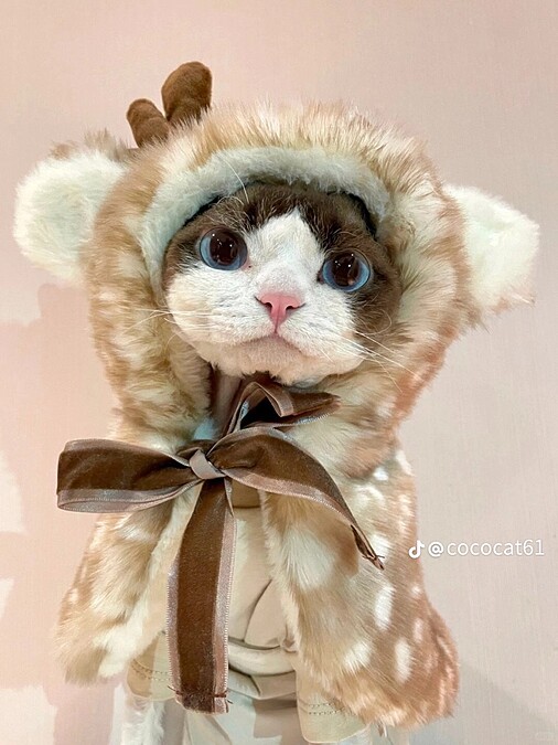 這麼可愛的小貓當然也有當甜妹的時候!Coco的貓耳朵毛帽有許多款,其中不乏非常少女的粉色蝴蝶結造型,或是穿上應景的麋鹿毛毛斗篷,實在太Q了吧!