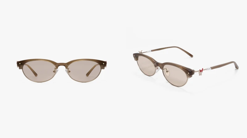 以俐落眉框線條搭配金屬結構,鏡腿上飾有聯名限定「櫻桃怪」造型細節,為極簡造型注入幽默可愛的亮點。