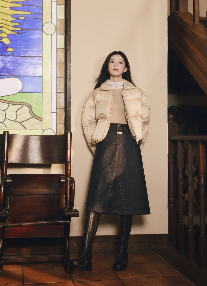 除此之外,他也選用丹寧長裙搭配羽絨外套,營造整體俐落率性的特質,上身較為短版的設計能讓整體比例更修長~