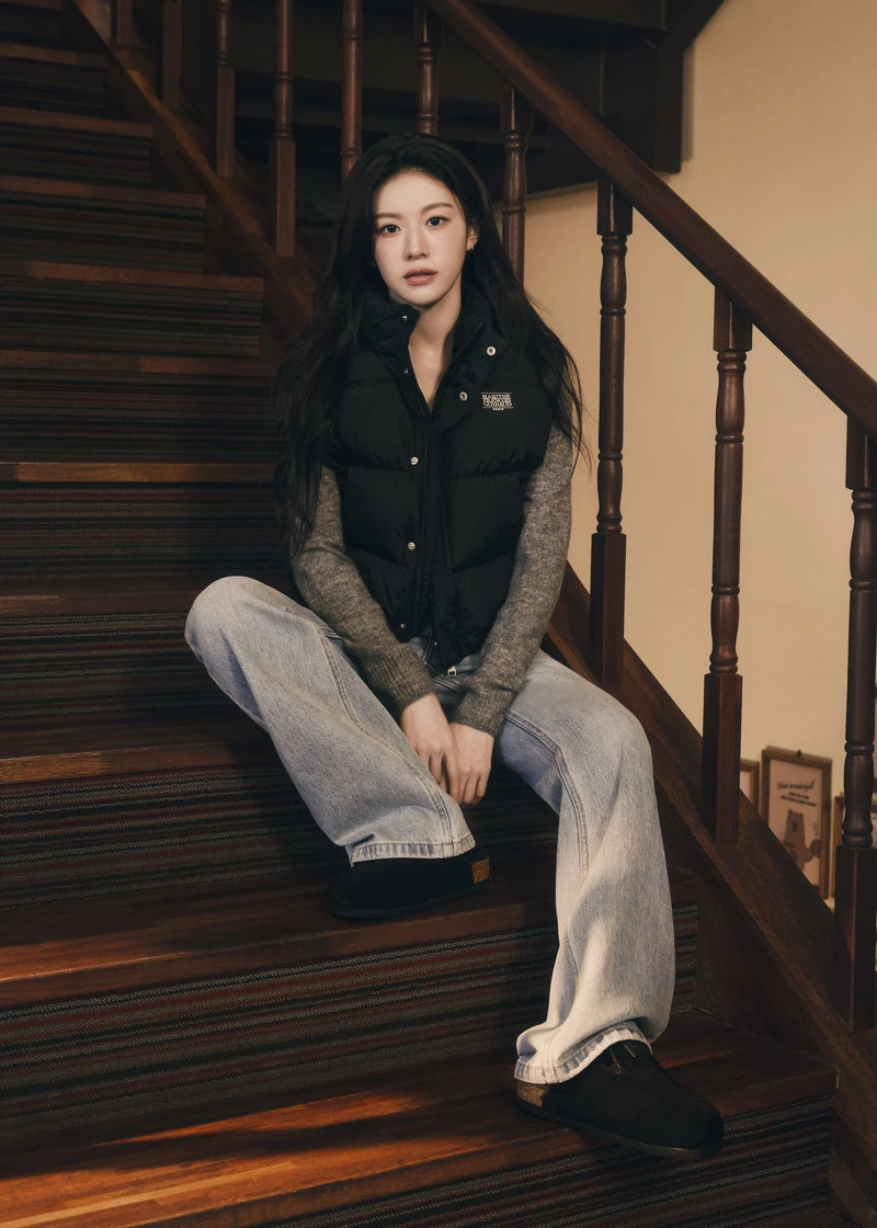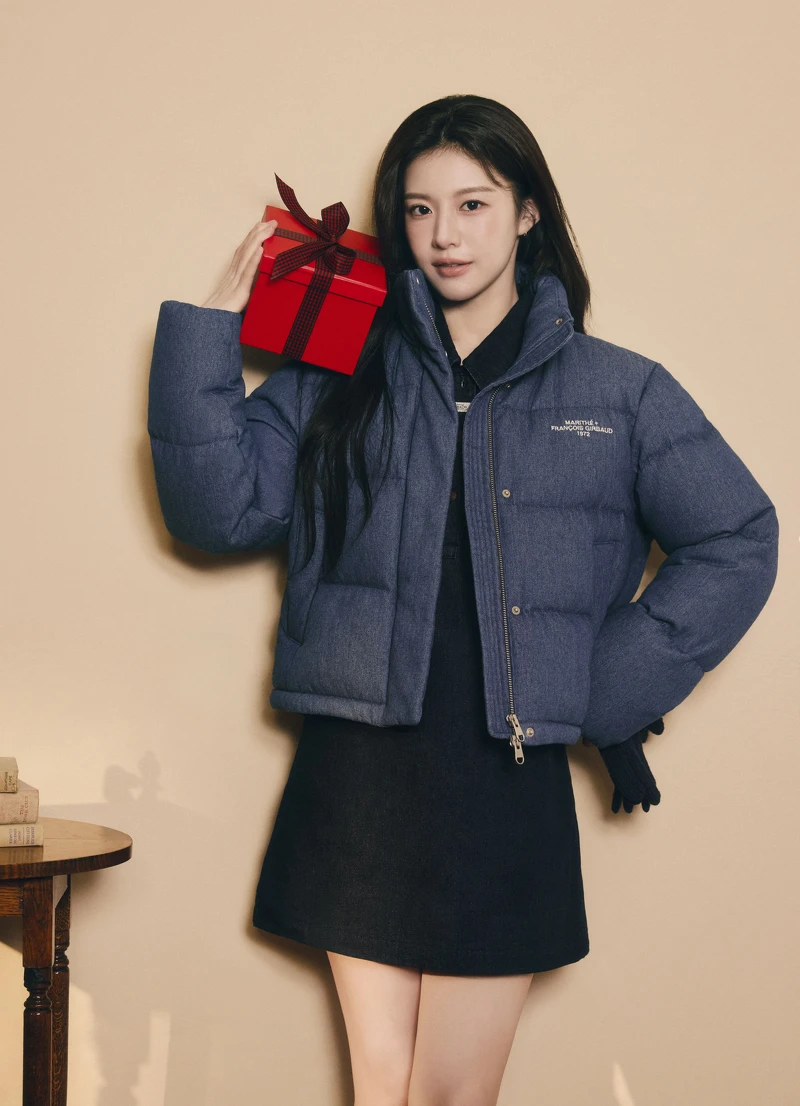 首先看到一套高允貞身著天藍色羽絨外套造型,整體運用簡潔的米色調突顯外套色系,誰說秋冬一定要穿一身黑,亮色系更能展現年輕活力!