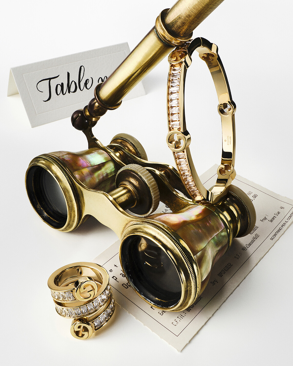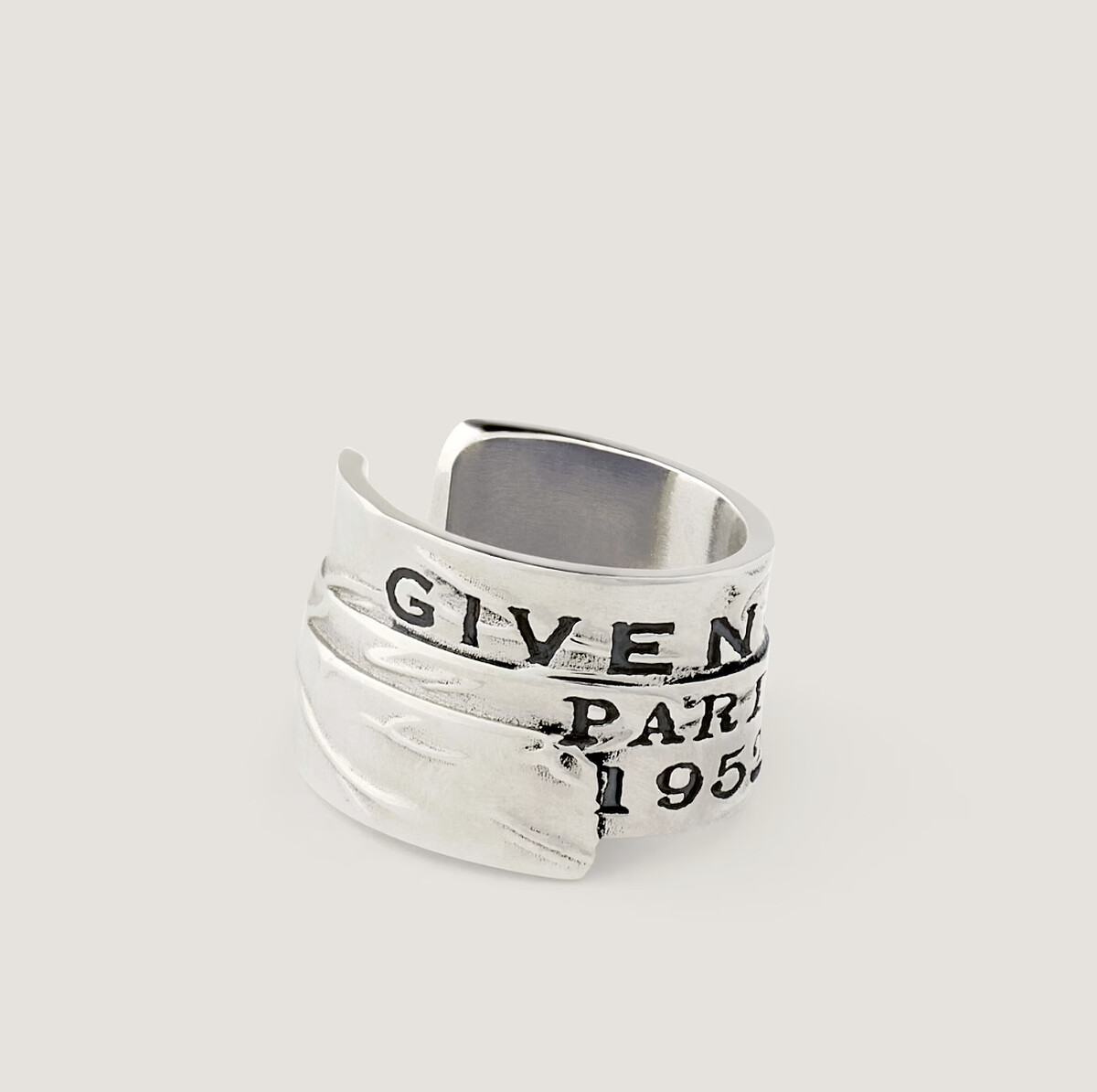復古銀色金屬搭配黑色琺瑯,「GIVENCHY Paris 1952」字樣宛如錄音間的膠帶。從耳輪滑入的造型方式非常前衛。