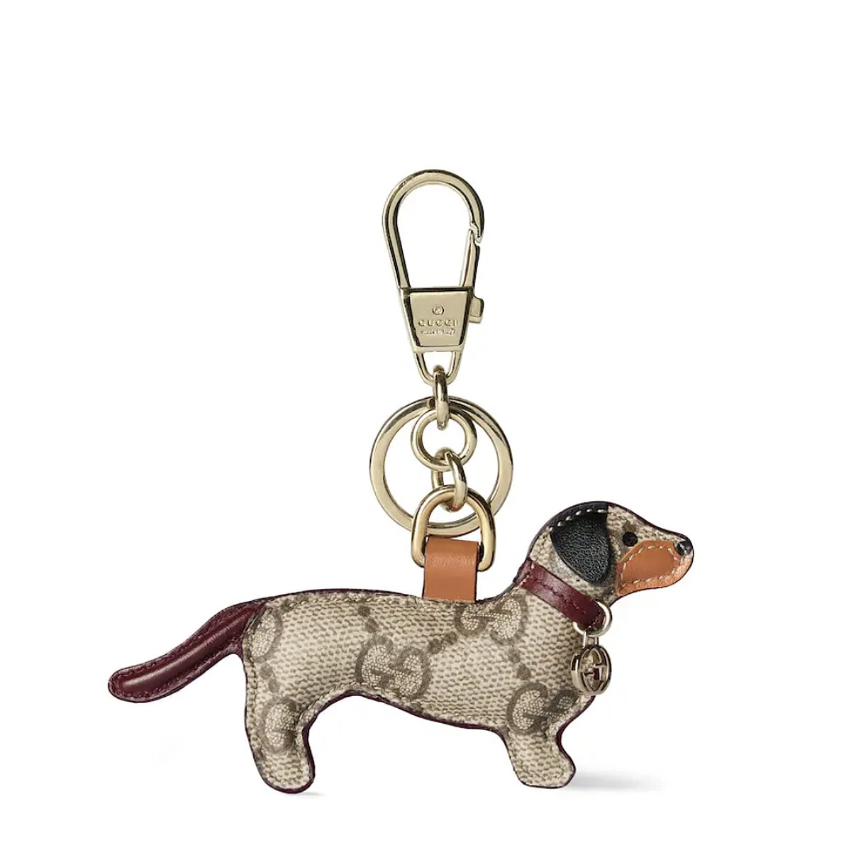 米色 GG 圖案帆布、多色皮革小狗造型,搭扣開合,可作包飾或鑰匙圈。
