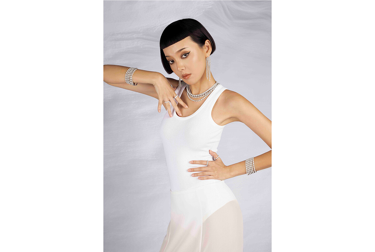 靈感來自冰面裂痕與光影交錯的瞬間之美,銀白金屬線條交錯搭配閃耀鋯石,宛如冰晶折射的幾何紋理,獨樹一格的建築感與現代氣息,讓珠寶呈現新穎的視覺樣貌,不僅呼應冬日主題,更為整體造型注入未來感與藝術張力。