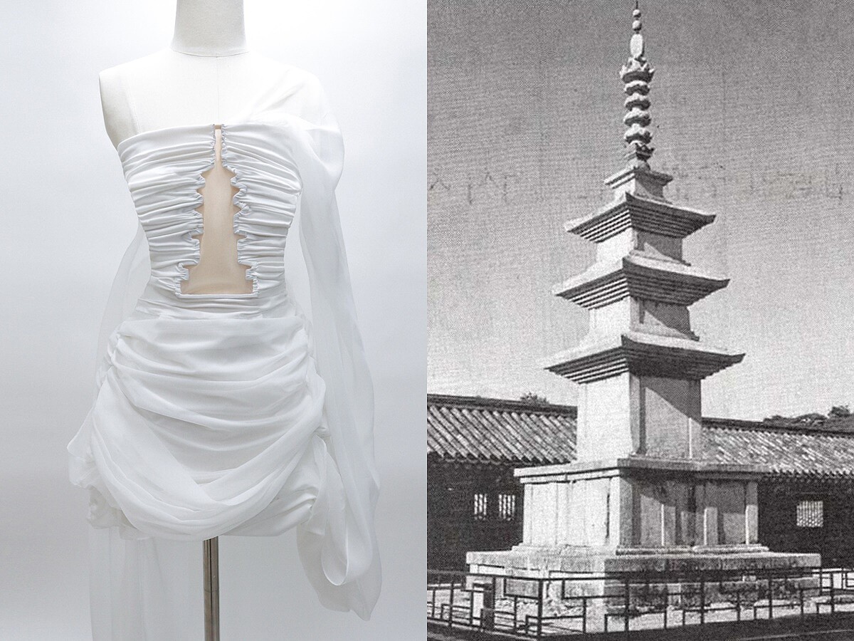 最後Jennie站上領獎台上的禮服,LEJE在禮服中央透過手工垂墜與鏤空細節,製成特殊形狀的留白,旨在致敬佛國寺釋迦塔的幾何美學。