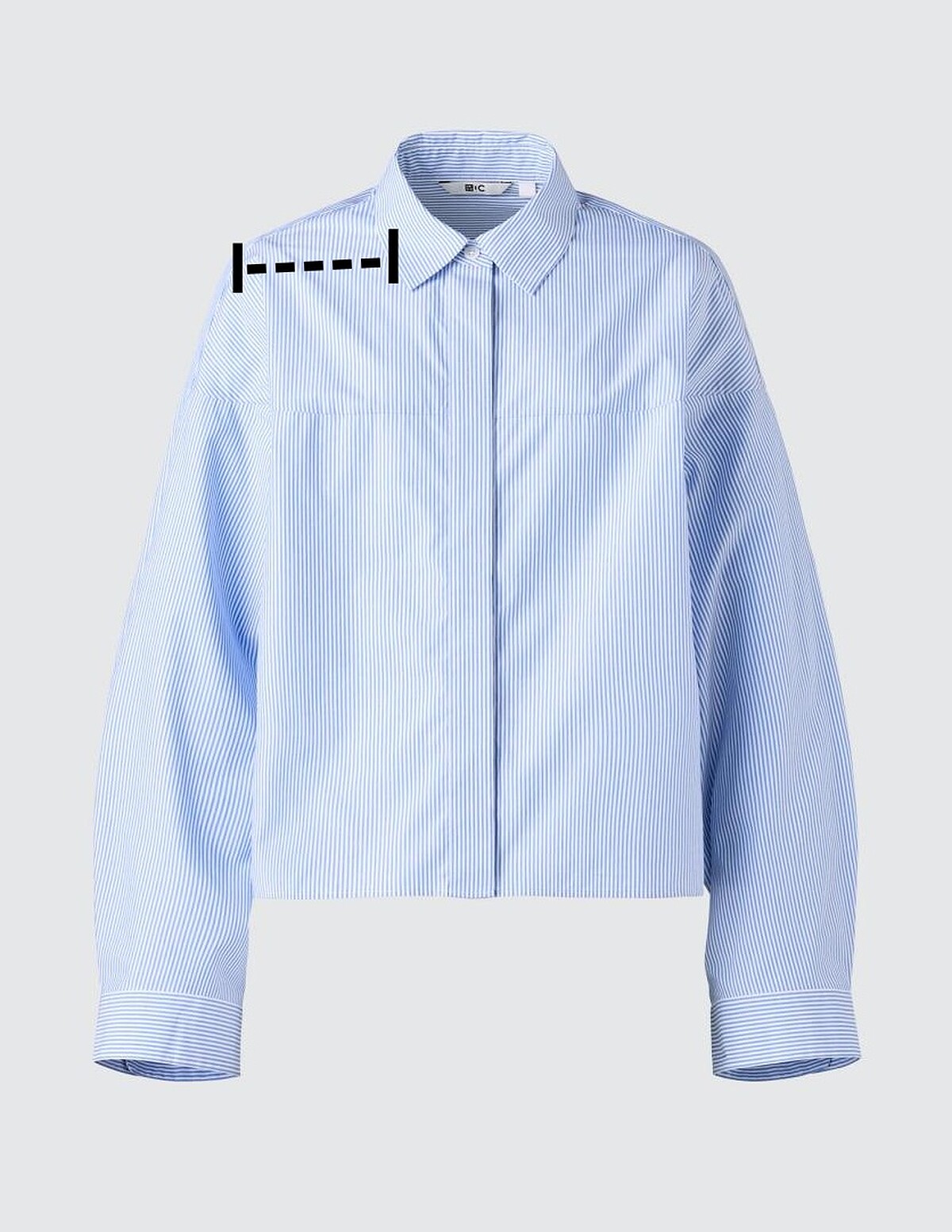上衣雖然比較不容易出錯,但肩線的部份對於穿上後的版型也有相當的影響,如果想快速判斷這件上衣的肩寬適不適合自己,可以拳頭作為單肩比例單位,從脖子外側到衣服肩線的位置快速比對。