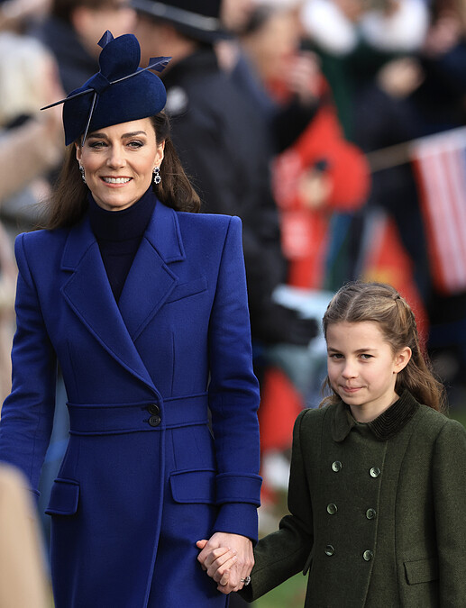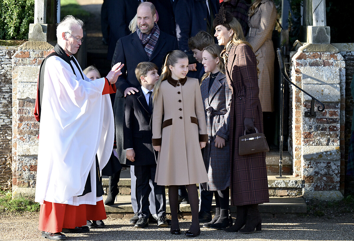 2023年聖誕禮拜,夏綠蒂公主身穿一件深色雙排釦大衣,剪裁筆直、材質厚實,幾乎完全褪去他稚嫩的模樣。這是一套標準的英式冬季正式服。 他的造型與母親落在同一成熟色階中,除了呼應節慶的氛圍,也再次展現家族的協調搭配。