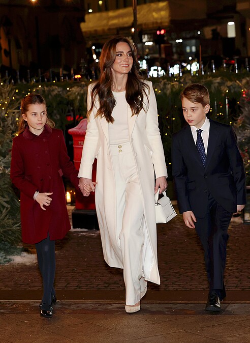 在2023年耶誕頌歌音樂會的夜間進場畫面中,夏綠蒂公主身穿酒紅色大衣,剪裁簡潔、長度過膝,線條筆直俐落。這是一個極具節慶象徵、既呼應耶誕氛圍,也保留正式場合所需的沉穩。畫面中夏綠蒂牽著凱特王妃的手行走於燈光之中,凱特王妃選擇象牙白長版大衣,形成清楚而優雅的色彩對比:一深一淺,讓畫面既有層次,也維持整體的風格。