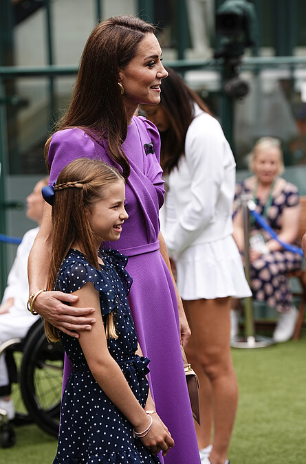 2025 年溫布頓,夏綠蒂公主身穿一件白色洋裝,黑色滾邊勾勒清楚輪廓,線條俐落、比例修長,讓他展現優雅大方的氣度。白色在溫布頓具有高度的象徵性,相較母親的亮藍色洋裝,小公主的造型更顯低調,但也在場合中極為精準。