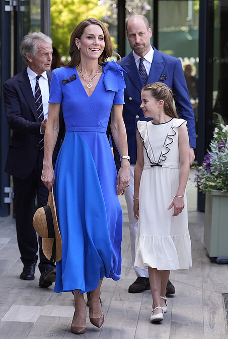 2024 年溫布頓,夏綠蒂小公主身穿一件深藍色原點洋裝,布料輕盈、線條簡潔,是非常符合觀賽的造型。