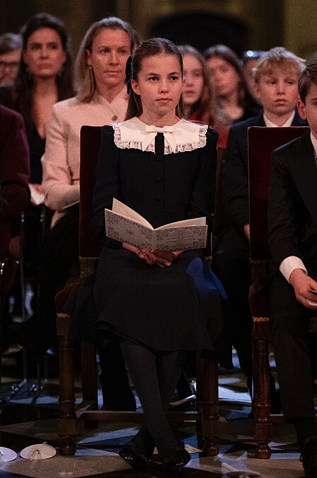 這是一場由凱特王妃主導的「Together at Christmas」耶誕頌歌音樂會,於西敏寺舉行的例行年度重要活動,其結合宗教、公共關懷與社會致敬的王室活動,邀請來自英國各地、在一年中展現非凡善意與同理心的人士齊聚一堂。活動中夏綠蒂公主認真的端坐於席位上,手持歌本,神情專注。而他身穿深色長袖洋裝,搭配白色蕾絲領口,整體造型優雅大方、又充滿尊重與沉靜的氣氛。