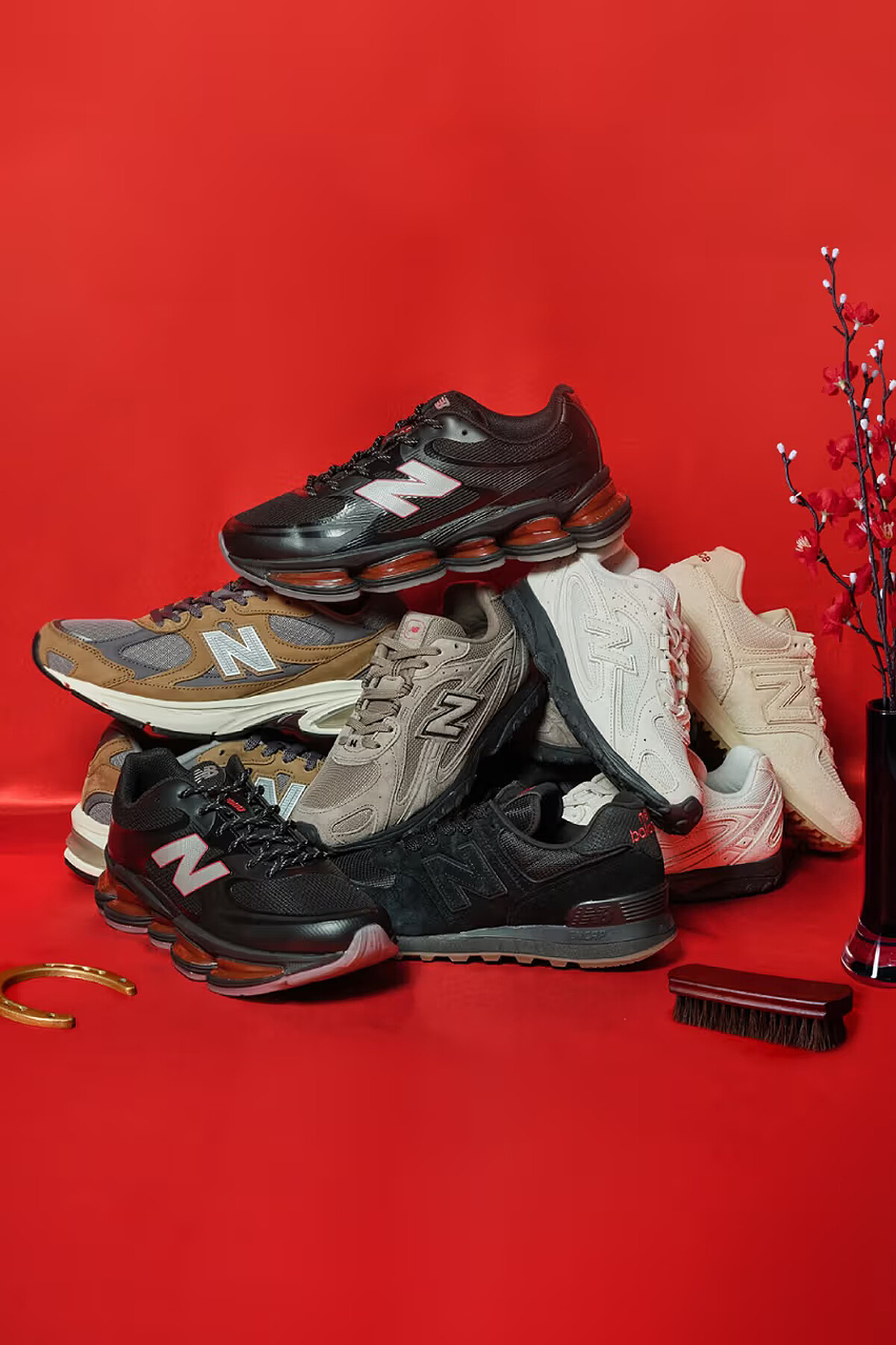 系列最後由兩款 574 收尾,以米白與黑色低調配色為主軸,僅以紅色品牌標誌點綴,耐看且實穿。同步推出的服飾系列涵蓋厚棉外套與燈芯絨長褲,完整詮釋新年主題。全系列將於 2026 年 1 月 1 日起,透過 New Balance 與 atmos 獨家發售。