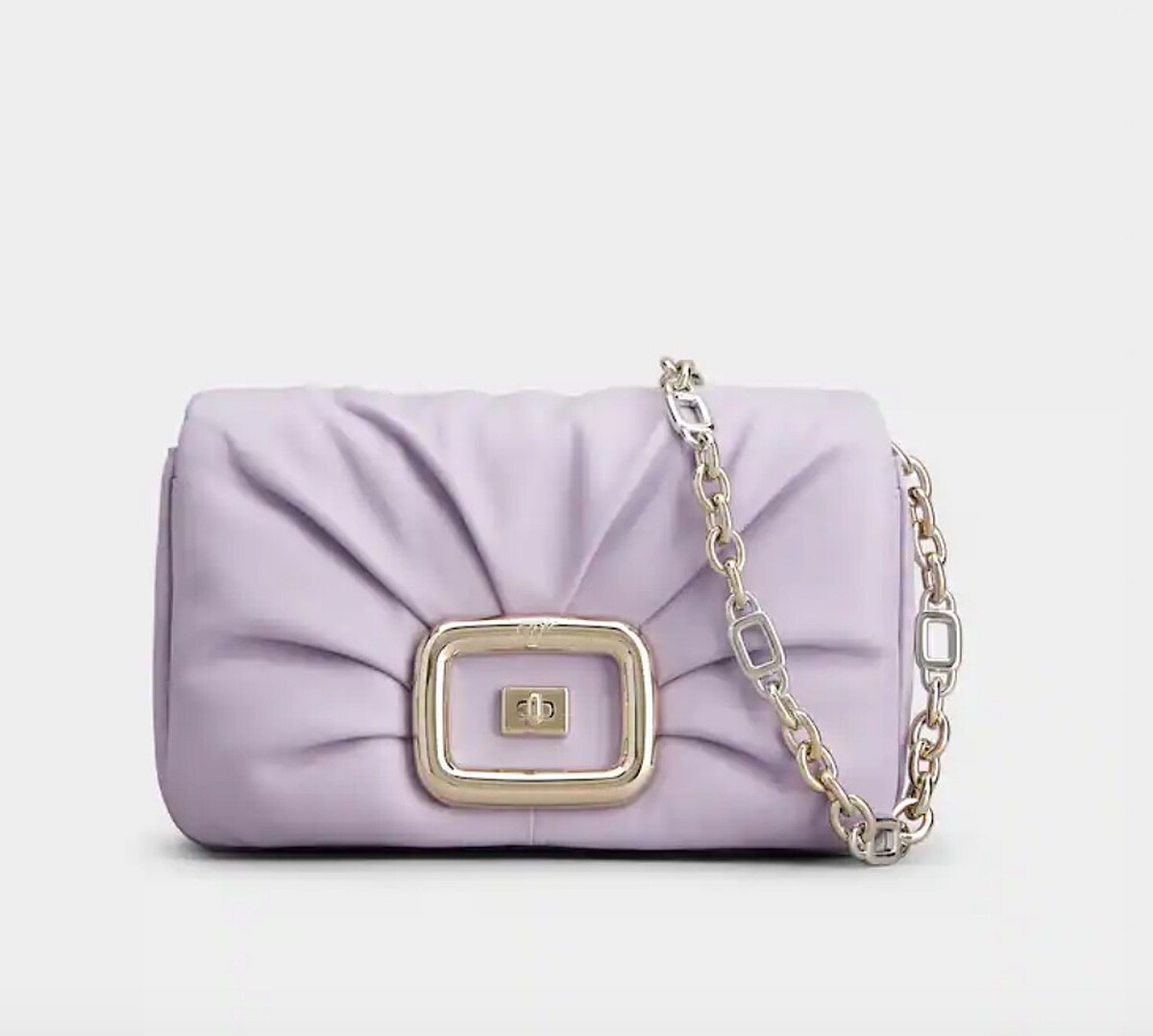 陳妍希在劇中雖然造型以簡約路線為主,但是在色彩選擇上卻毫不侷限,更是經常運用粉嫩的色調來達到減齡效果,像是粉色、紫色、淡綠色……都與她的冷白膚色特別相襯,手袋也不例外,當中這款丁香紫色的Roger Vivier Viv’ Choc擁有枕頭般的柔軟外型,能削弱剛硬的女強人氣場,營造出法式慵懶氣質。