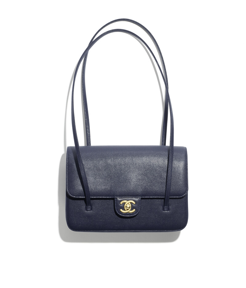 Jennie率先拿了一顆香奈兒深藍色雙C LOGO粒紋皮革翻蓋肩背包款。