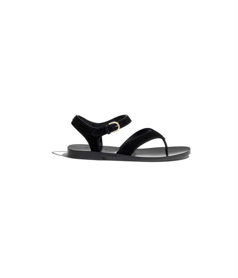 Chanel黑色麂皮與小牛皮夾腳涼鞋。