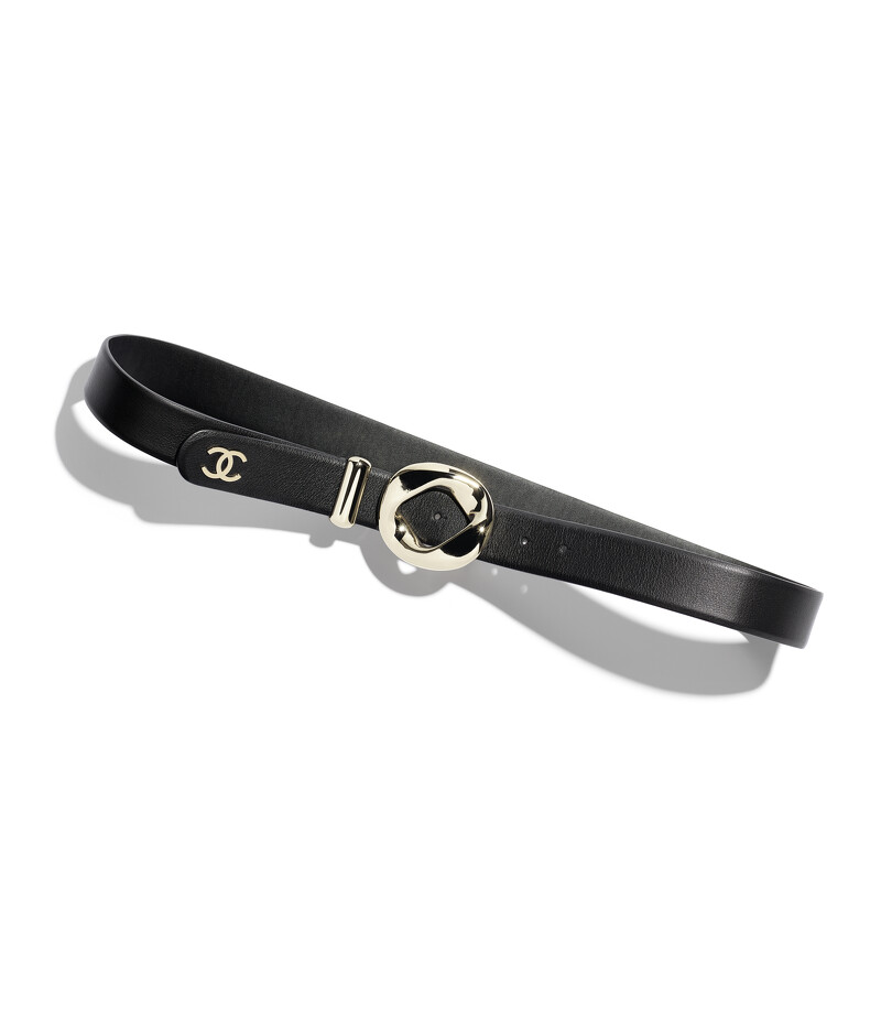 Chanel黑色綴以金色扣環皮帶。