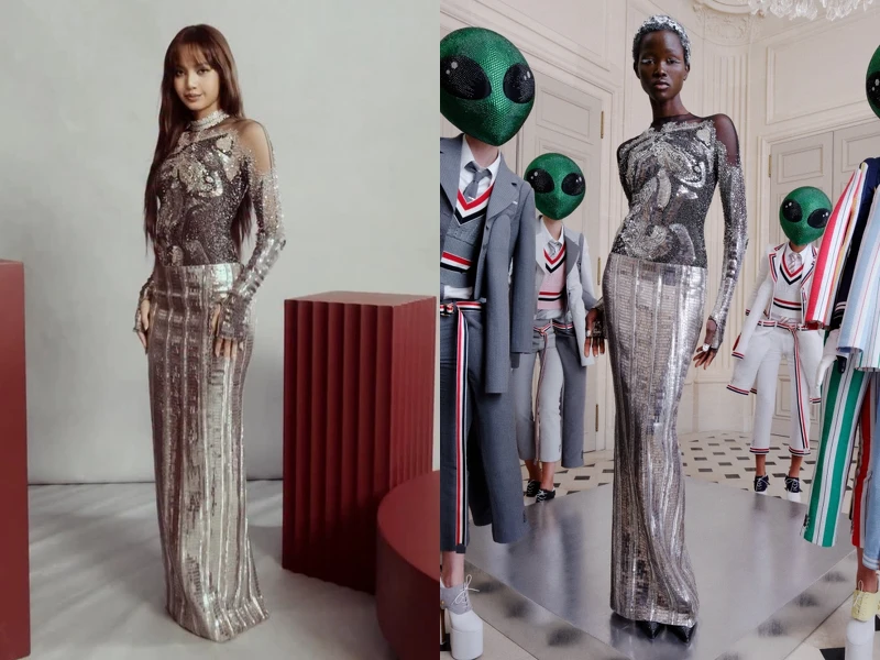 頒獎時Lisa驚喜的換上第二套風格截然不同的造型登上舞台,她選擇穿上了Thom Browne 2026春夏系列中的銀黑色金屬感禮服,整件禮服上都是串飾與閃片打造精緻細節,整體廓形裡俐落硬挺,讓Lisa展現出科技未來感的強勢風格,頸間搭配的華麗珠寶作品,也透過相似的色系與服裝展現出一氣呵成的高級感!