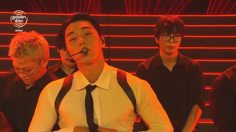 由朴星化、金弘中、丁潤浩、姜呂尚、崔傘、宋旼琦、鄭友榮、崔鍾浩等8位成員組成的韓國實力派男團ATEEZ,在2018年出道並成為首組登上COACHELLA舞台的韓國男團,這次因為金唱片來到台北,成員中以戴眼鏡霸總風格受到許多粉絲喜愛的成員崔傘,在個人Solo舞蹈段落中,脫下大衣後把「領帶塞近襯衫內」,搭配的皮革肩帶與幾乎要被他健壯身材撐爆的白襯衫造型,讓這段演出成了網路上瘋傳的金唱片名場面之一。