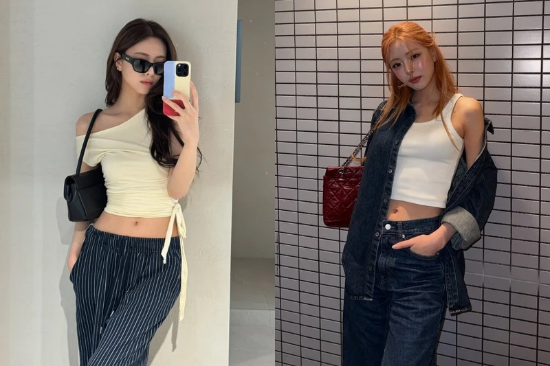 另一個重點,是有娜對下身版型的選擇非常聰明,許多人可能覺得短版上衣搭配高腰下身是顯瘦的經典組合,但回過頭看看有娜,她大多是選擇可以稍稍露出一點腹部肌膚的「中腰」褲型,搭配上不會太鬆垮的直線或微寬輪廓,這樣的下身也能在視覺上形成「腰很細、下半身很順」的效果。