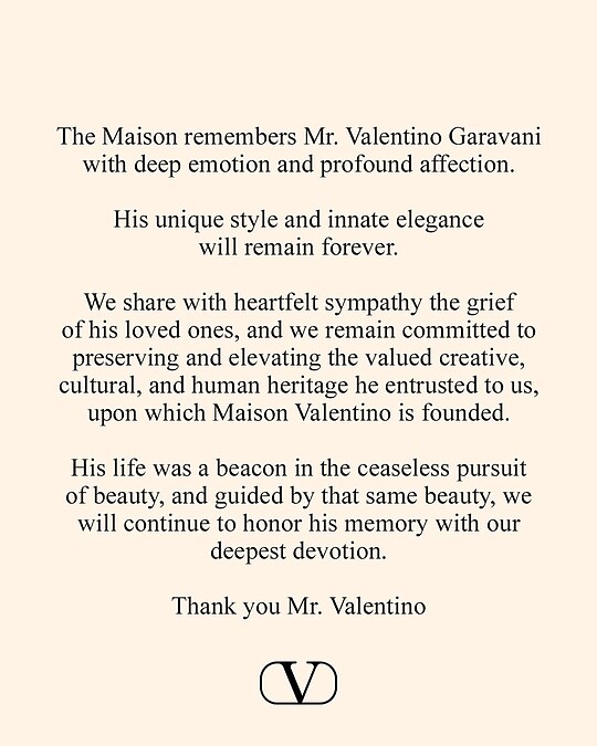 Valentino現任創意總監Alessandro Michele也在IG上深切哀悼Valentino Garavani的仙逝:「一位偉大的人今日離世。Valentino Garavani不僅是無可爭議的時尚巨星,更是義大利文化史上的核心人物。他以罕見的溫柔穿越世界,以沉默的力量,以無邊無際的愛,守護著美。所有曾與他共事、愛他、向他學習的人,哪怕只是遠遠地仰望過他,都將深深懷念這位大師。他為我們留下了一筆無可取代的遺產:創造,意味著好好對待自己;美,是一種激進的力量;必須以耐心去關注身體與形狀,經歷它們,並珍惜與它們共處的時間。如果,如詩人所言:『愛,是延續另一個人的言說。』那麼,我們的任務,便是承接這份愛的債,珍視那些已被說出的語言,在被賦予的時間裡,讓它們持續發聲。透過我們的姿態,透過我們所生活的世界。此刻,在工作之中,我強烈感受到他的目光依然注視著我們——帶著衡量,帶著責任,也帶著對一切仍然可能的優雅與恩典的承諾。」