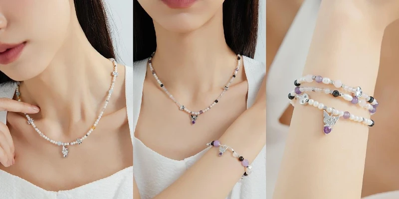 Kuromi天然石輕珠寶全系列商品,包含手鍊、項鍊、戒指、耳環,此系列金屬採用銀色不鏽鋼,並融入酷洛米的頭像輪廓與尾巴的線條設計,水晶則搭配酷洛米『紫、黑、白』的經典代表色,選用象徵智慧的紫水晶、辟邪與守護的黑瑪瑙以及象徵純潔與高貴的天然珍珠,整體設計呈現出角色獨有的個性靈魂,展現酷帥甜心「酷洛米」的專屬魅力!