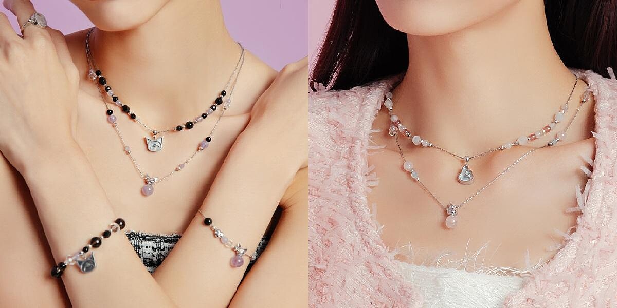 飾品設計上全採用不鏽鋼材質,維持長久配戴不易氧化,並巧妙融入兩位角色的經典元素,美樂蒂以經典的「粉×白」為主要色系,展現溫柔甜美,而酷洛米則是以「紫×黑×白」色系呈現,散發俏皮又帶點帥氣的小反差魅力。