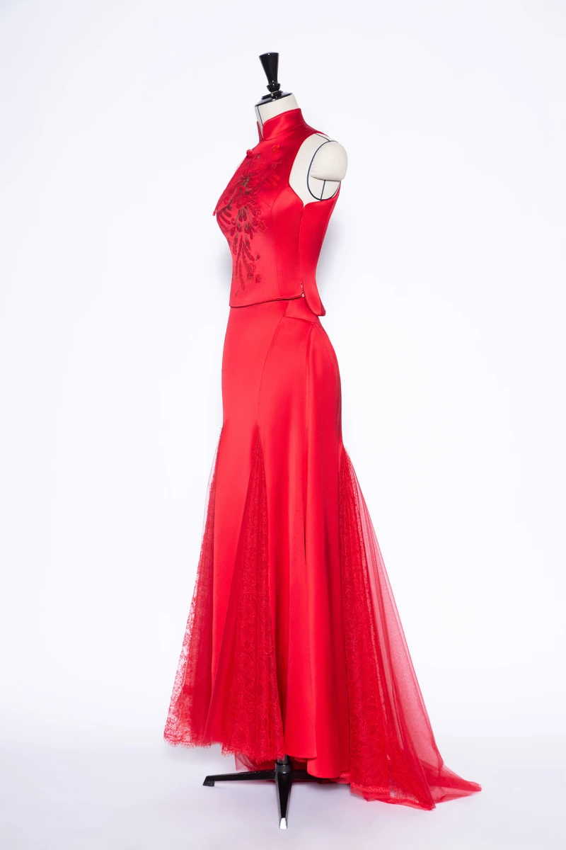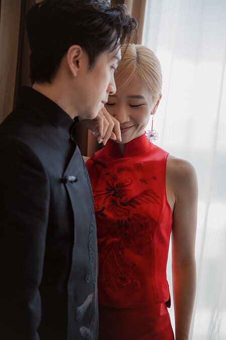 新娘 Lulu 身著夏姿・陳經典「夏姿紅」中式訂製婚服,以立領削肩背心搭配蕾絲絲緞拼接的魚尾拖曳長裙,兩件式設計巧妙勾勒出嬌小而俐落的身形比例。削肩線條與中式立領相互呼應,在剛柔之間展現女性優雅與自信。清雅而不張揚的紅色調,為年輕世代演繹當代語境下的東方美學。