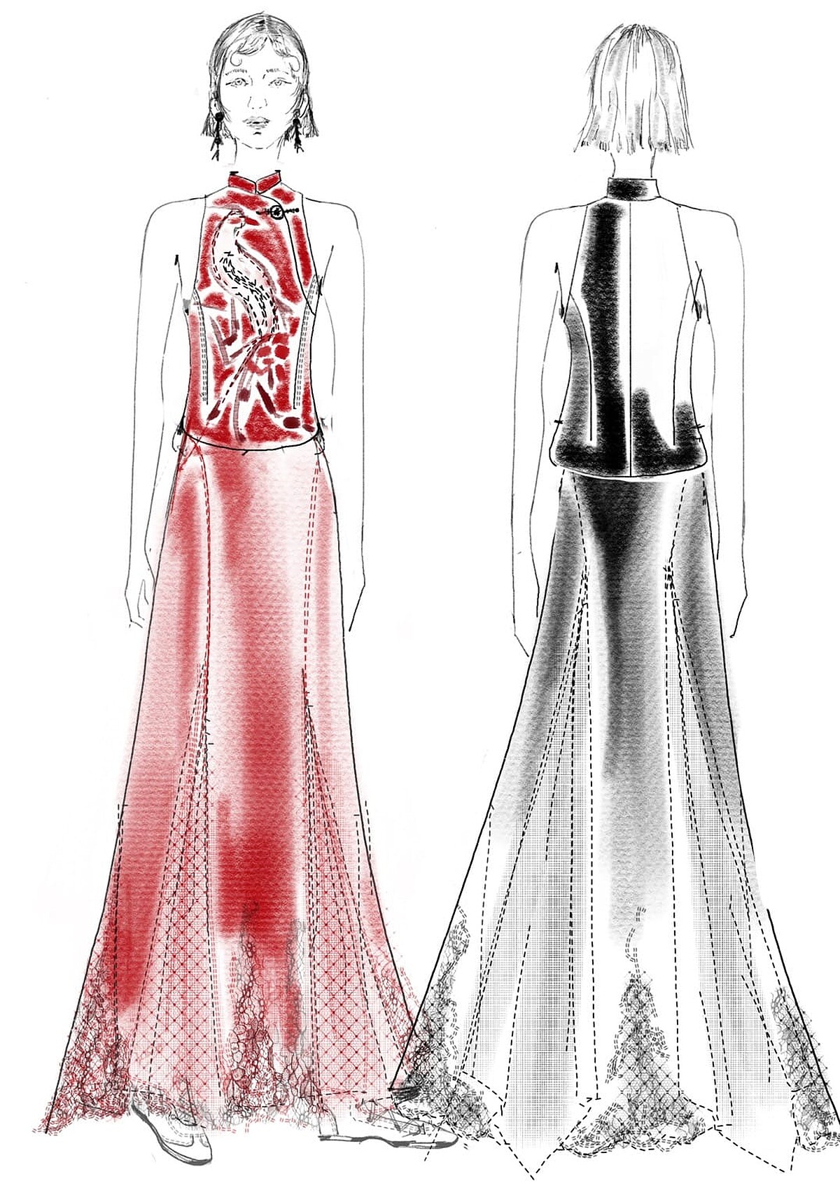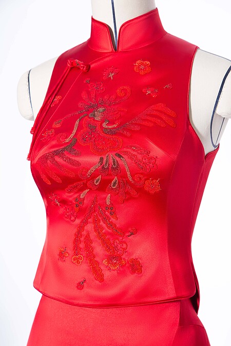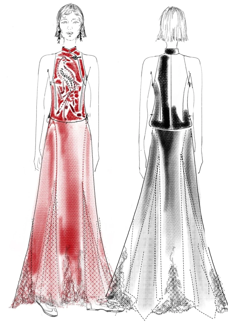 禮服以「鳳」為核心意象,象徵柔韌、祥瑞與祝福,細膩的設計語彙中蘊含對婚姻圓滿與和合的期許,也與新郎禮服上的「龍」意象形成呼應,寓意雙方相互扶持、彼此成就。