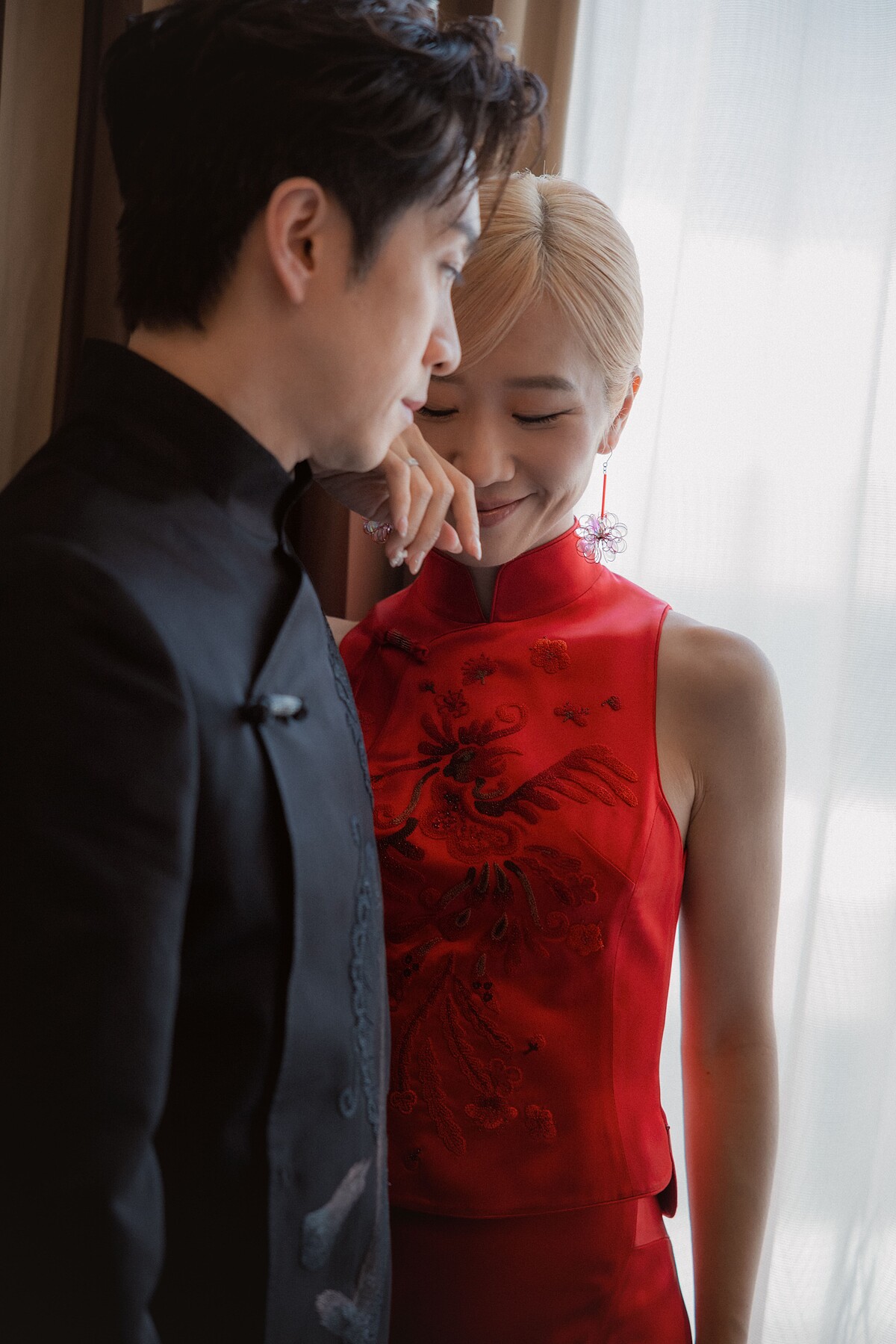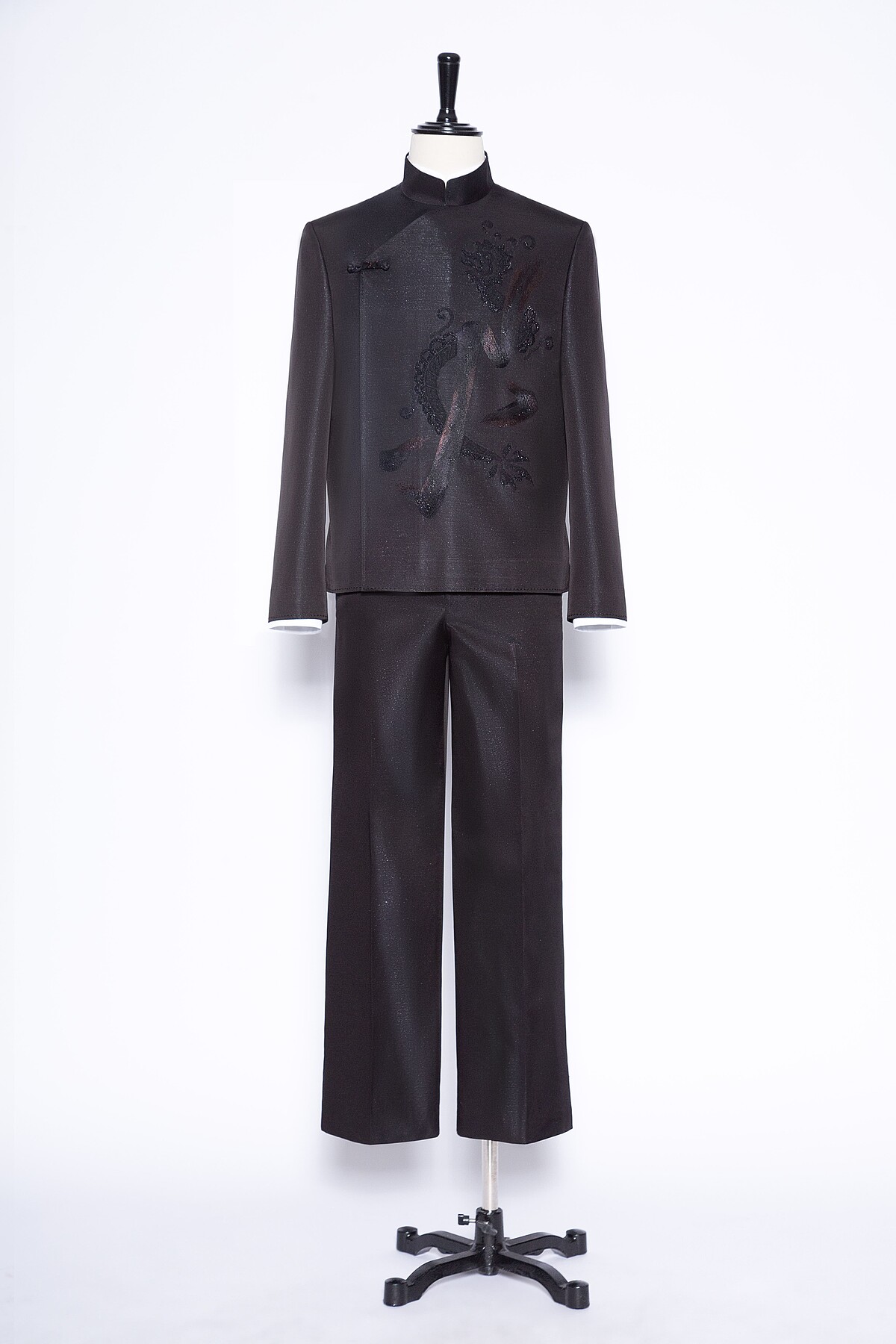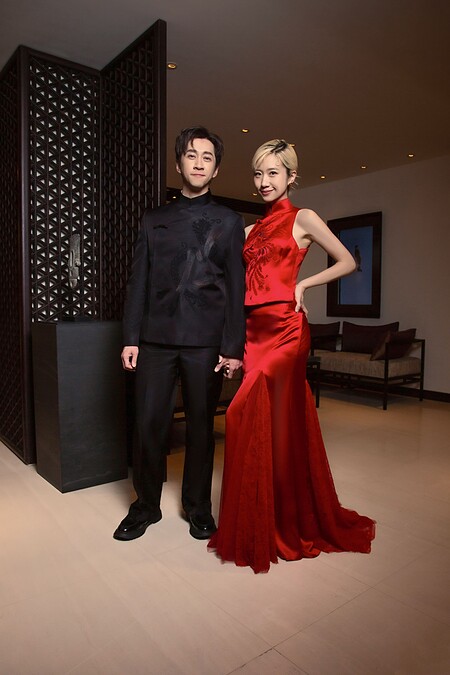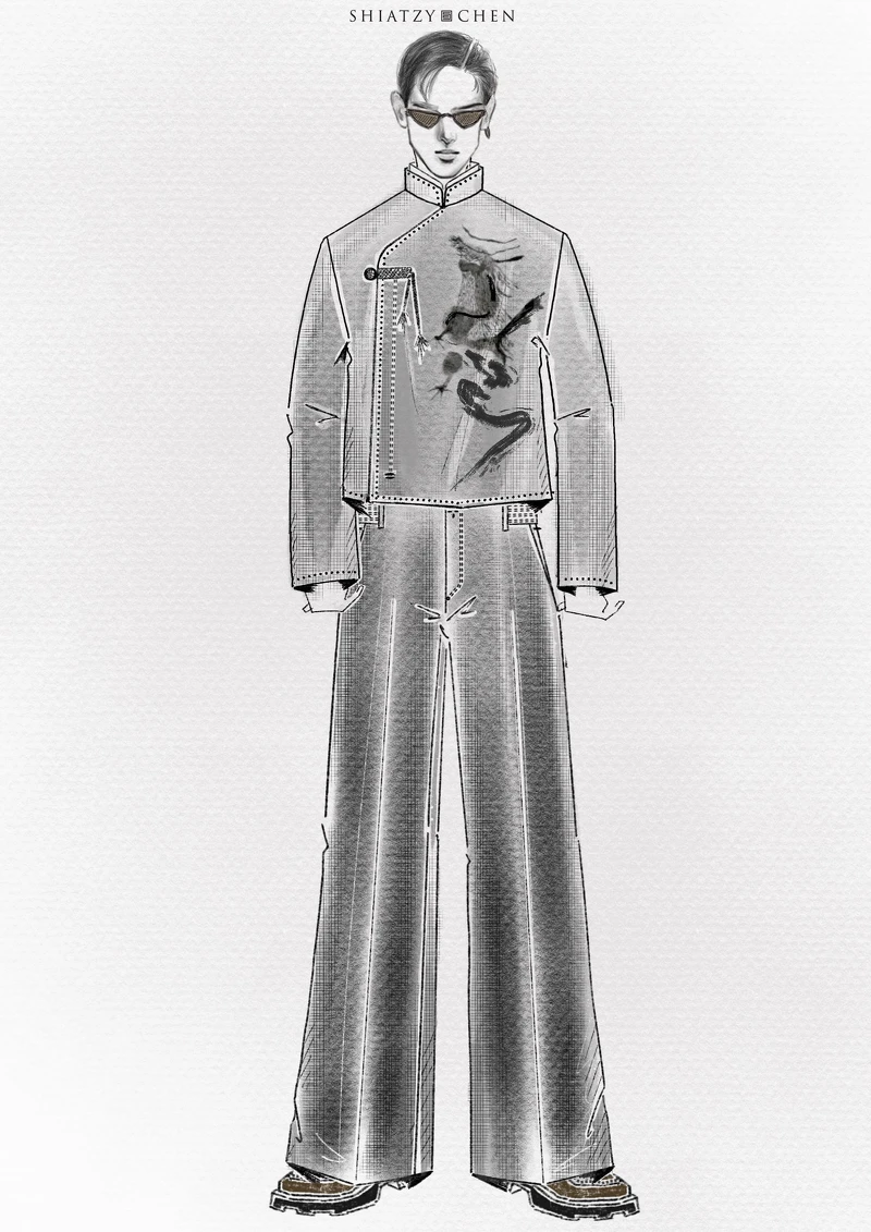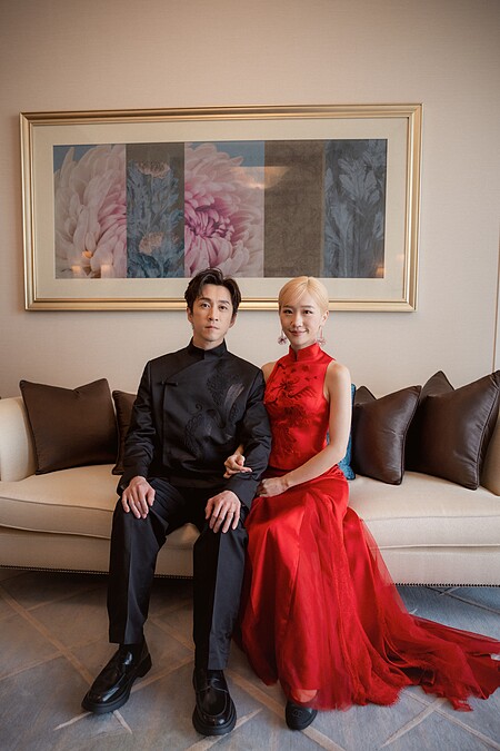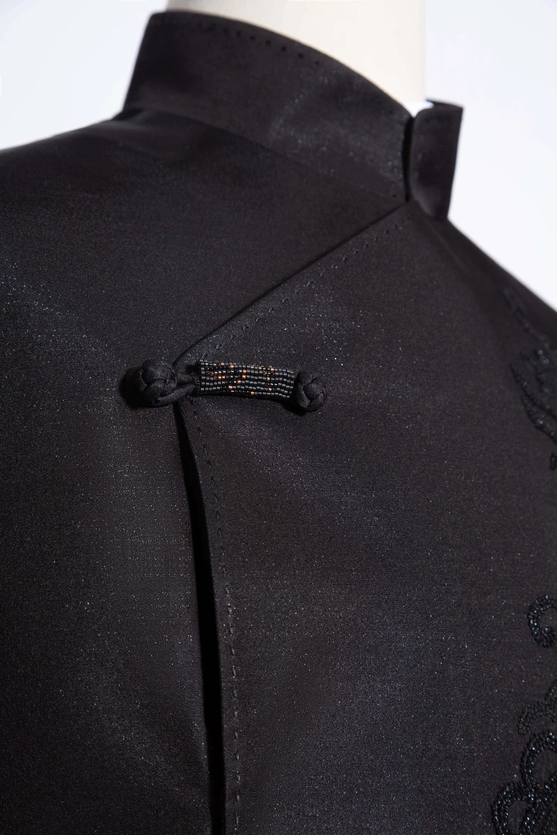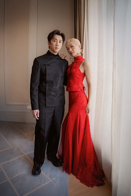 新郎陳漢典則選擇全黑中式訂製禮服,以西裝輪廓為基礎,低調融合中式立領與斜襟元素,形塑出兼具文化深度與現代感的中式正裝風格。俐落結構線條強化肩線比例,使整體造型更顯挺拔修長。胸前大面積「龍」刺繡象徵氣度與守護,在沉穩內斂中展現力量。
