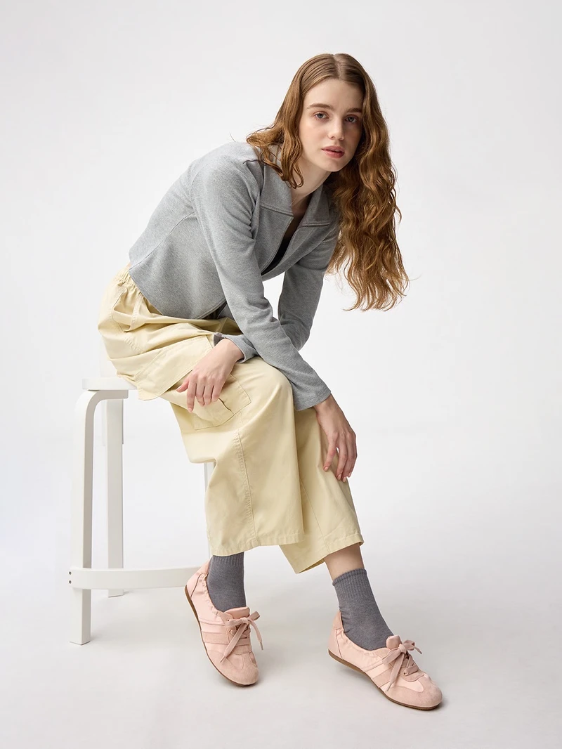 這雙「抓褶芭蕾運動鞋」有著一雙薄底球鞋的外型,雖然融入芭蕾舞鞋的淺口設計,仍保留鞋帶的設計,不僅增加運動感,也巧妙運用蝴蝶結元素提升少女感。本雙鞋款的設計感關鍵在於鬆緊抽皺的細節,別具優雅質感,且不需要解開鞋帶即可隨時穿脫。