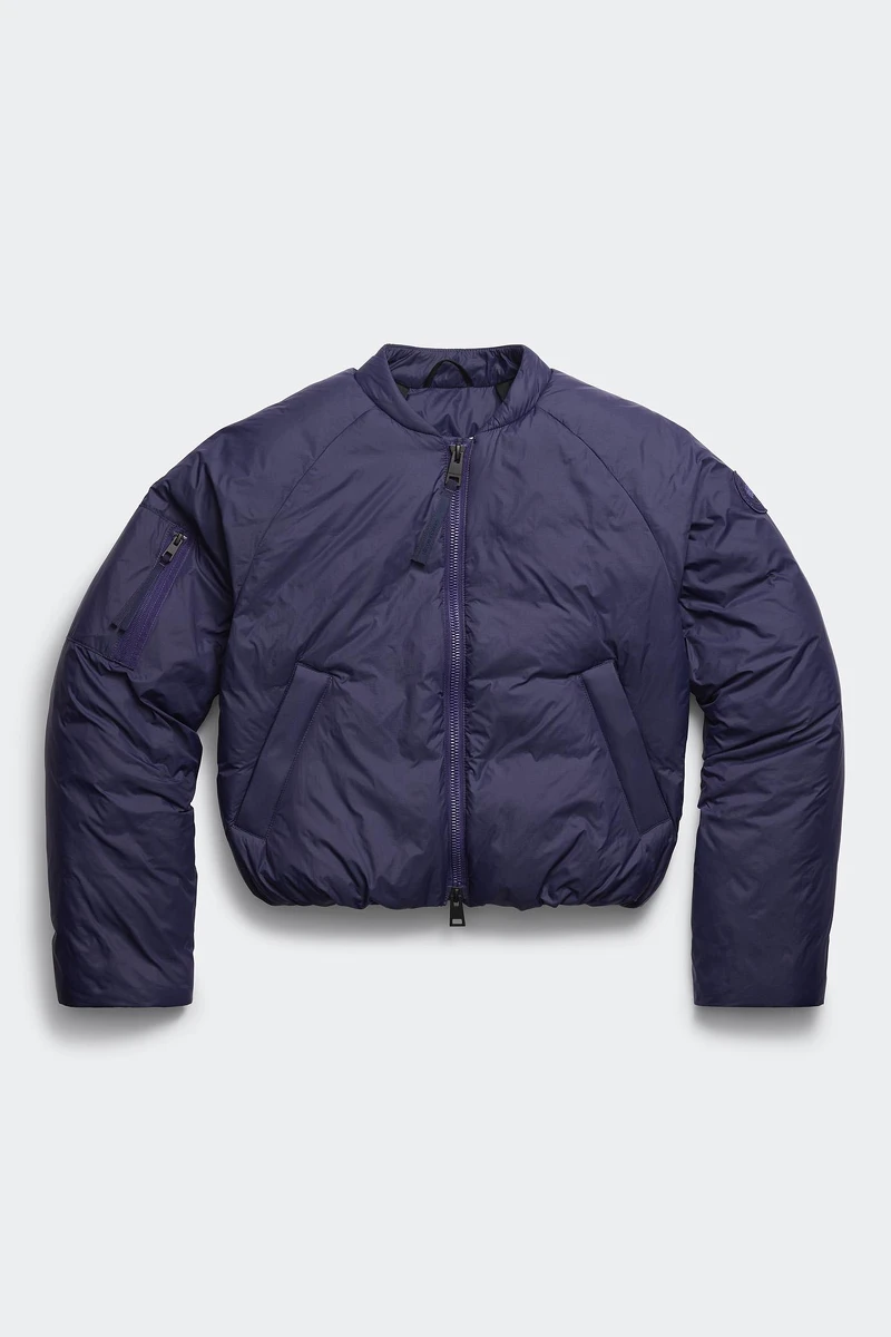 此款融合經典飛行外套語彙與羽絨機能,Elba 以短版剪裁展現率性風格,搭配 Lumina 面料的柔軟觸感與自然光澤。輕盈保暖、不顯厚重,為冬季穿搭注入更鮮明的大鵝風格與個性層次。