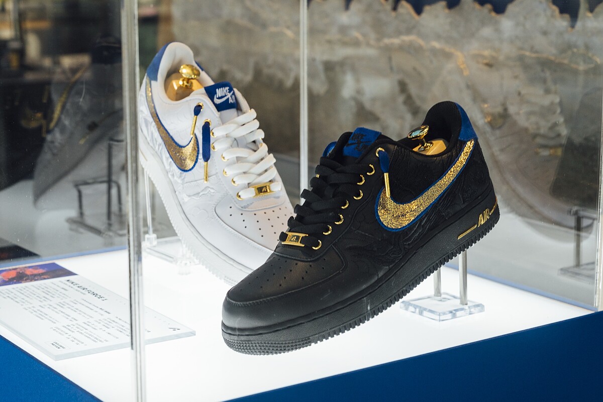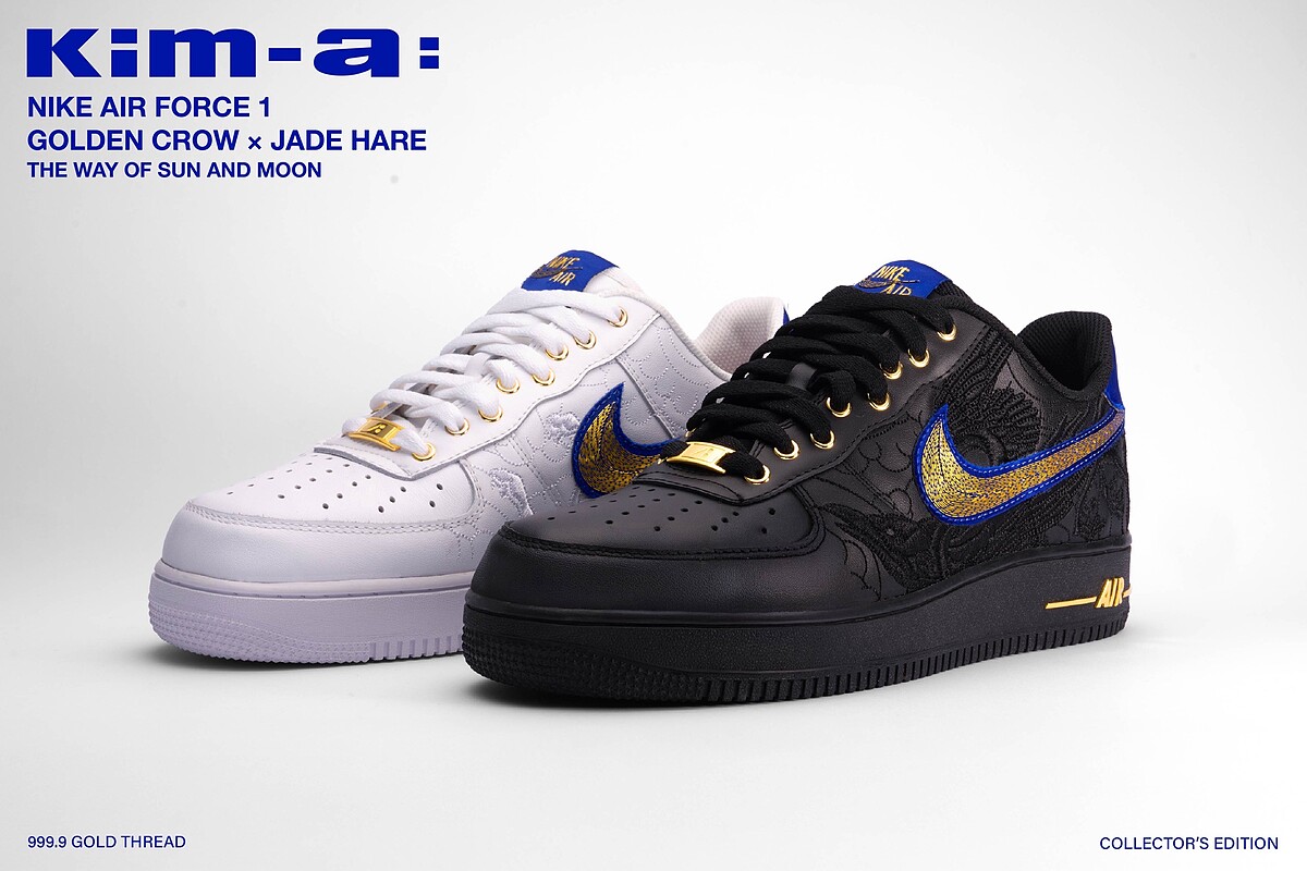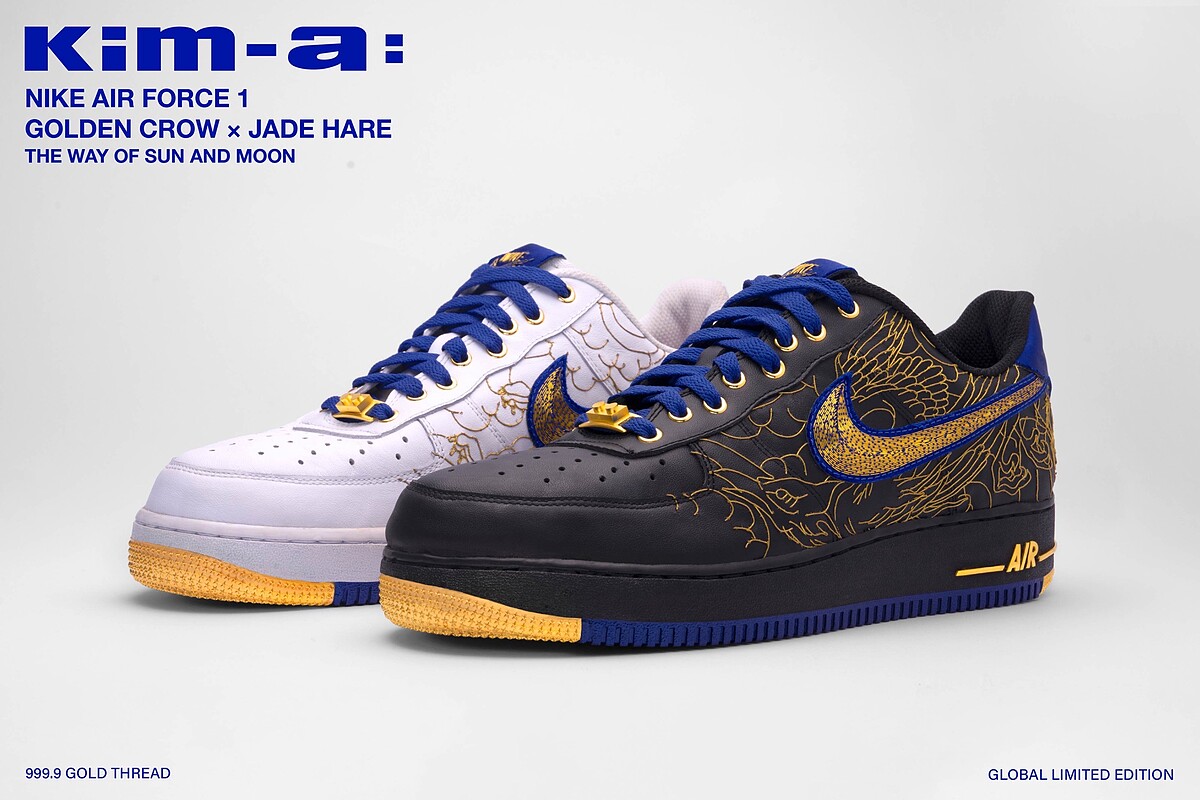 Nike Air Force 1限量版黃金鞋最初亮相於2025年 ComplexCon Las Vegas 潮流藝術盛會,在Nike的支持與授權下,台灣潮流黃金品牌Kim-a:以「999.9 純金縫製 Nike Air Force 1」為題進行實驗性創作,並加入了象徵太陽的「金烏」與象徵月亮的「玉兔」刺繡,將頂級規格融合東方文化的元素,替作品提升藝術與靈性,發表後迅速獲得國際藏家們的高度關注。2026年kim-a: 首度攜此作品展開全球巡迴,首站回到台灣,落腳台中老虎城進行期間限定展出。