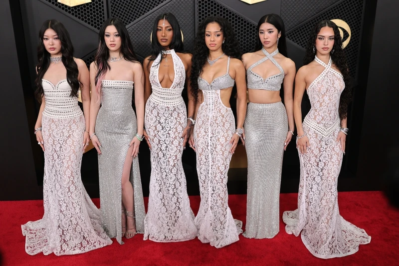 入圍本屆葛萊美「最佳新人」以及「最佳流行團體/組合」的KATSEYE全員以Ludovic De Saint Sernin透膚蕾絲與銀色系呼應的性感造型登上紅毯,展現團體魅力!